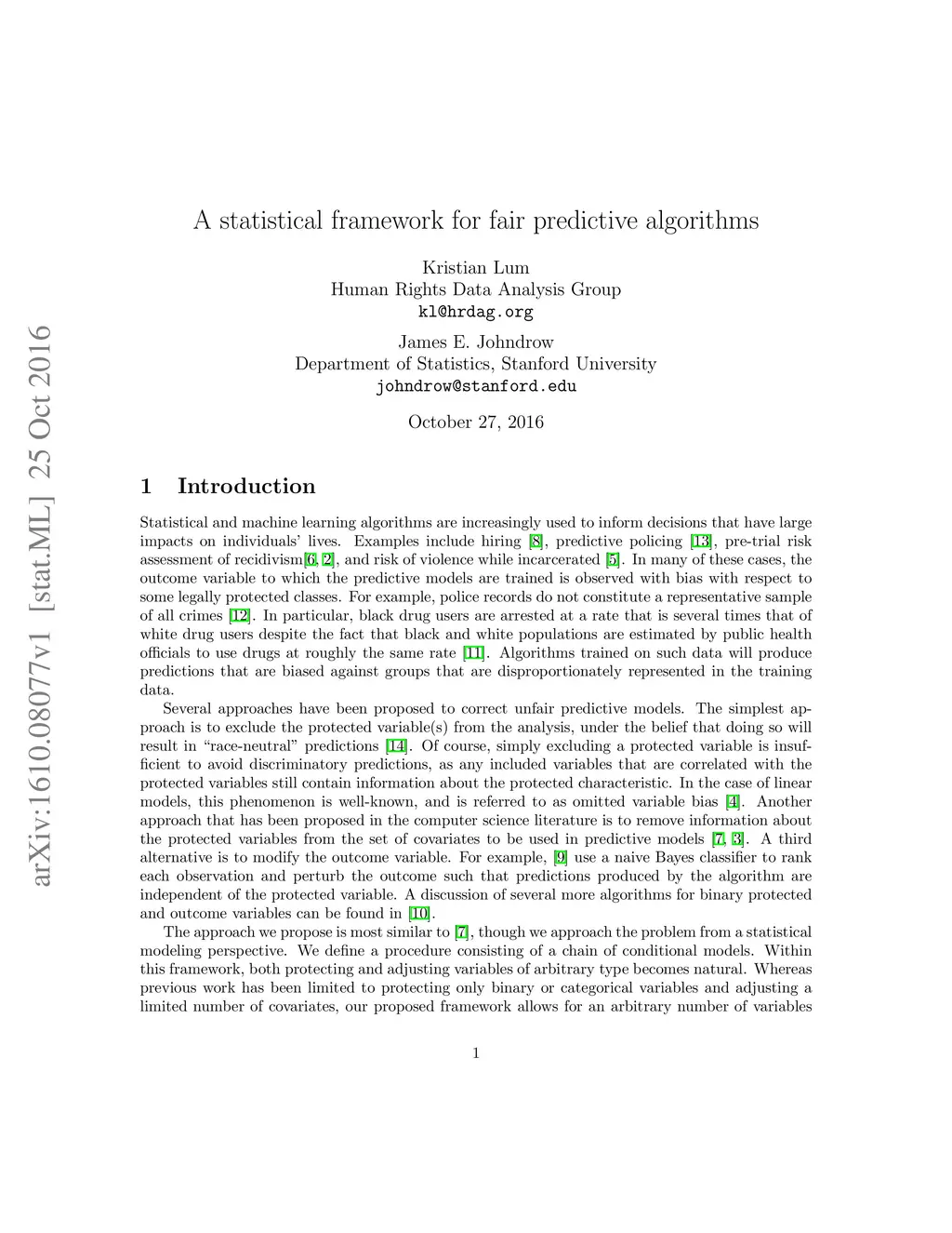 A statistical framework for fair predictive algorithms