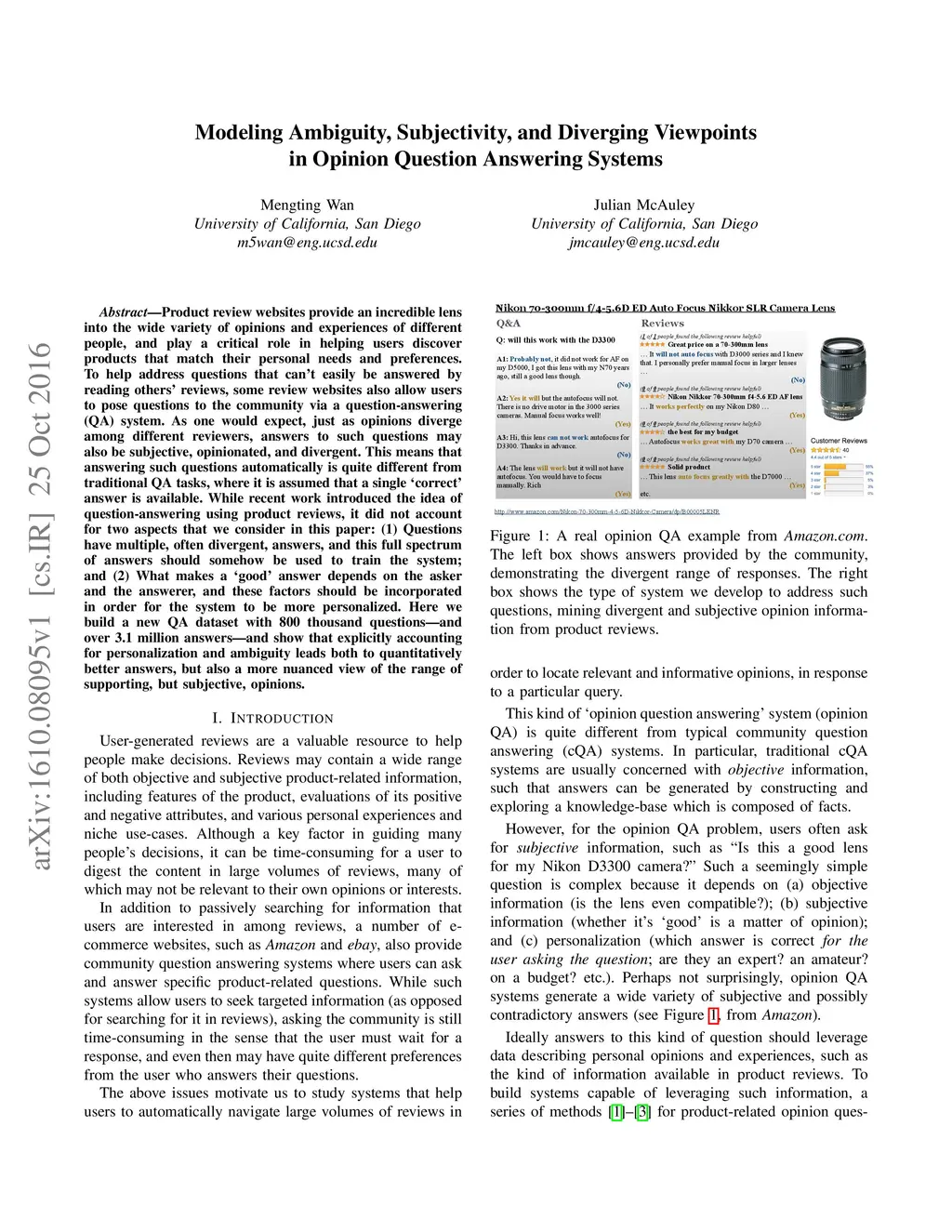 Product review websites provide an incredible lens into the wide variety of opinions and experiences of different people, and play a critical role in helping users discover products that match their personal needs and preferences. To help address questions that can't easily be answered by reading others' reviews, some review websites also allow users to pose questions to the community via a question-answering (QA) system. As one would expect, just as opinions diverge among different reviewers, answers to such questions may also be subjective, opinionated, and divergent. This means that answering such questions automatically is quite different from traditional QA tasks, where it is assumed that a single `correct' answer is available. While recent work introduced the idea of question-answering using product reviews, it did not account for two aspects that we consider in this paper: (1) Questions have multiple, often divergent, answers, and this full spectrum of answers should somehow be used to train the system; and (2) What makes a `good' answer depends on the asker and the answerer, and these factors should be incorporated in order for the system to be more personalized. Here we build a new QA dataset with 800 thousand questions---and over 3.1 million answers---and show that explicitly accounting for personalization and ambiguity leads both to quantitatively better answers, but also a more nuanced view of the range of supporting, but subjective, opinions.