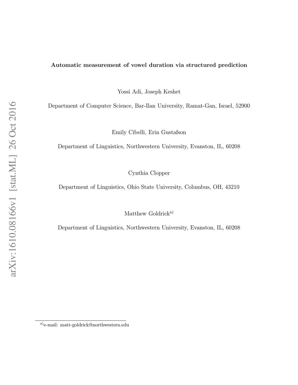 A key barrier to making phonetic studies scalable and replicable is the need to rely on subjective, manual annotation. To help meet this challenge, a machine learning algorithm was developed for automatic measurement of a widely used phonetic measure: vowel duration. Manually-annotated data were used to train a model that takes as input an arbitrary length segment of the acoustic signal containing a single vowel that is preceded and followed by consonants and outputs the duration of the vowel. The model is based on the structured prediction framework. The input signal and a hypothesized set of a vowel's onset and offset are mapped to an abstract vector space by a set of acoustic feature functions. The learning algorithm is trained in this space to minimize the difference in expectations between predicted and manually-measured vowel durations. The trained model can then automatically estimate vowel durations without phonetic or orthographic transcription. Results comparing the model to three sets of manually annotated data suggest it out-performed the current gold standard for duration measurement, an HMM-based forced aligner (which requires orthographic or phonetic transcription as an input).