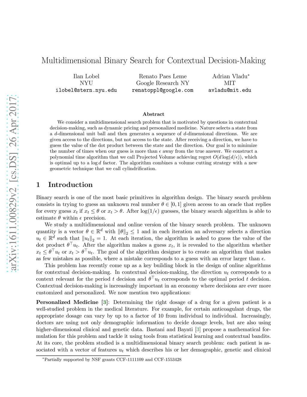 We consider a multidimensional search problem that is motivated by questions in contextual decision-making, such as dynamic pricing and personalized medicine. Nature selects a state from a -dimensional unit ball and then generates a sequence of -dimensional directions. We are given access to the directions, but not access to the state. After receiving a direction, we have to guess the value of the dot product between the state and the direction. Our goal is to minimize the number of times when our guess is more than away from the true answer. We construct a polynomial time algorithm that we call Projected Volume achieving regret , which is optimal up to a factor. The algorithm combines a volume cutting strategy with a new geometric technique that we call cylindrification.