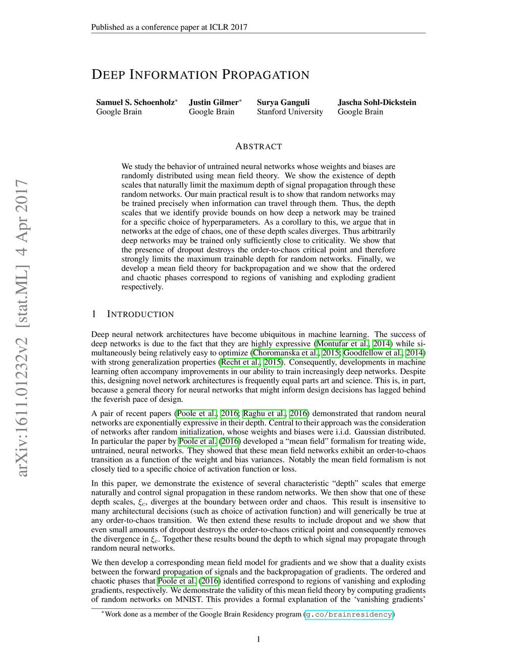 We study the behavior of untrained neural networks whose weights and biases are randomly distributed using mean field theory. We show the existence of depth scales that naturally limit the maximum depth of signal propagation through these random networks. Our main practical result is to show that random networks may be trained precisely when information can travel through them. Thus, the depth scales that we identify provide bounds on how deep a network may be trained for a specific choice of hyperparameters. As a corollary to this, we argue that in networks at the edge of chaos, one of these depth scales diverges. Thus arbitrarily deep networks may be trained only sufficiently close to criticality. We show that the presence of dropout destroys the order-to-chaos critical point and therefore strongly limits the maximum trainable depth for random networks. Finally, we develop a mean field theory for backpropagation and we show that the ordered and chaotic phases correspond to regions of vanishing and exploding gradient respectively.