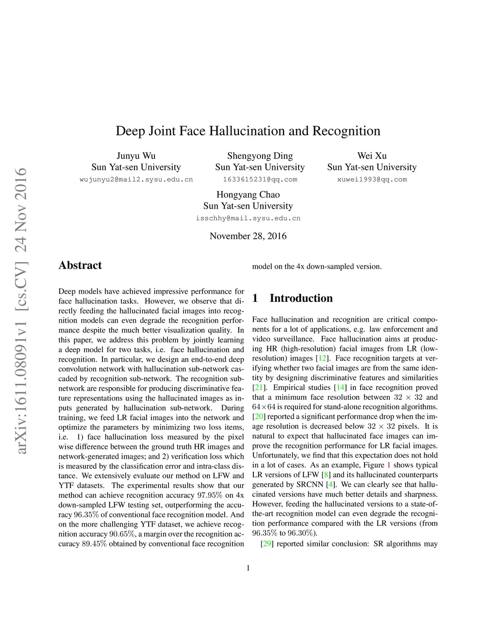 Deep models have achieved impressive performance for face hallucination tasks. However, we observe that directly feeding the hallucinated facial images into recog- nition models can even degrade the recognition performance despite the much better visualization quality. In this paper, we address this problem by jointly learning a deep model for two tasks, i.e. face hallucination and recognition. In particular, we design an end-to-end deep convolution network with hallucination sub-network cascaded by recognition sub-network. The recognition sub- network are responsible for producing discriminative feature representations using the hallucinated images as inputs generated by hallucination sub-network. During training, we feed LR facial images into the network and optimize the parameters by minimizing two loss items, i.e. 1) face hallucination loss measured by the pixel wise difference between the ground truth HR images and network-generated images; and 2) verification loss which is measured by the classification error and intra-class distance. We extensively evaluate our method on LFW and YTF datasets. The experimental results show that our method can achieve recognition accuracy 97.95% on 4x down-sampled LFW testing set, outperforming the accuracy 96.35% of conventional face recognition model. And on the more challenging YTF dataset, we achieve recognition accuracy 90.65%, a margin over the recognition accuracy 89.45% obtained by conventional face recognition model on the 4x down-sampled version.
