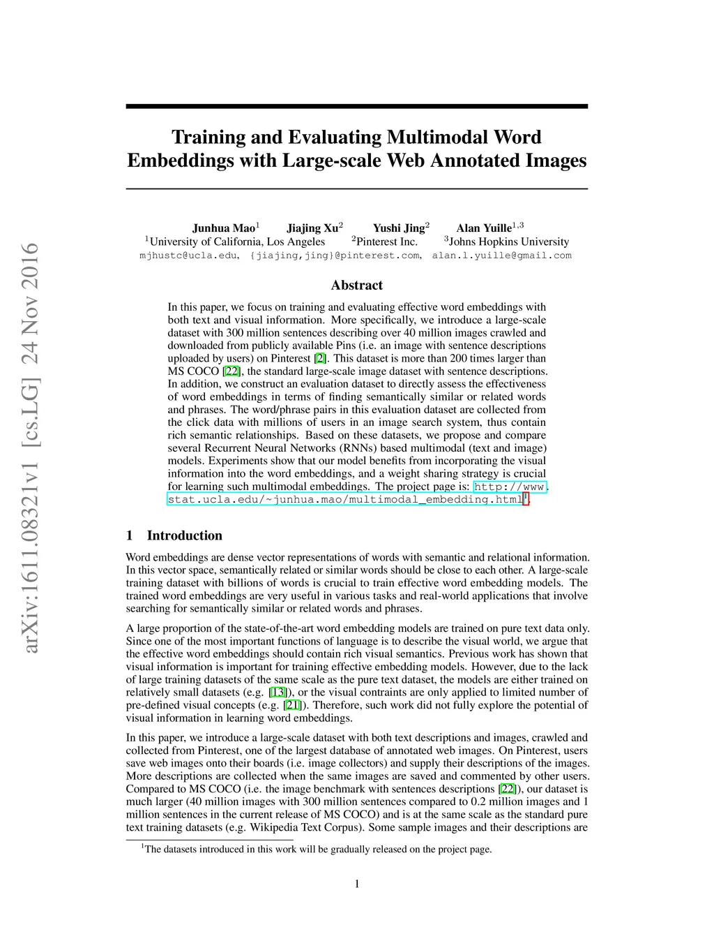 In this paper, we focus on training and evaluating effective word embeddings with both text and visual information. More specifically, we introduce a large-scale dataset with 300 million sentences describing over 40 million images crawled and downloaded from publicly available Pins (i.e. an image with sentence descriptions uploaded by users) on Pinterest. This dataset is more than 200 times larger than MS COCO, the standard large-scale image dataset with sentence descriptions. In addition, we construct an evaluation dataset to directly assess the effectiveness of word embeddings in terms of finding semantically similar or related words and phrases. The word/phrase pairs in this evaluation dataset are collected from the click data with millions of users in an image search system, thus contain rich semantic relationships. Based on these datasets, we propose and compare several Recurrent Neural Networks (RNNs) based multimodal (text and image) models. Experiments show that our model benefits from incorporating the visual information into the word embeddings, and a weight sharing strategy is crucial for learning such multimodal embeddings. The project page is: http://www.stat.ucla.edu/~junhua.mao/multimodal_embedding.html