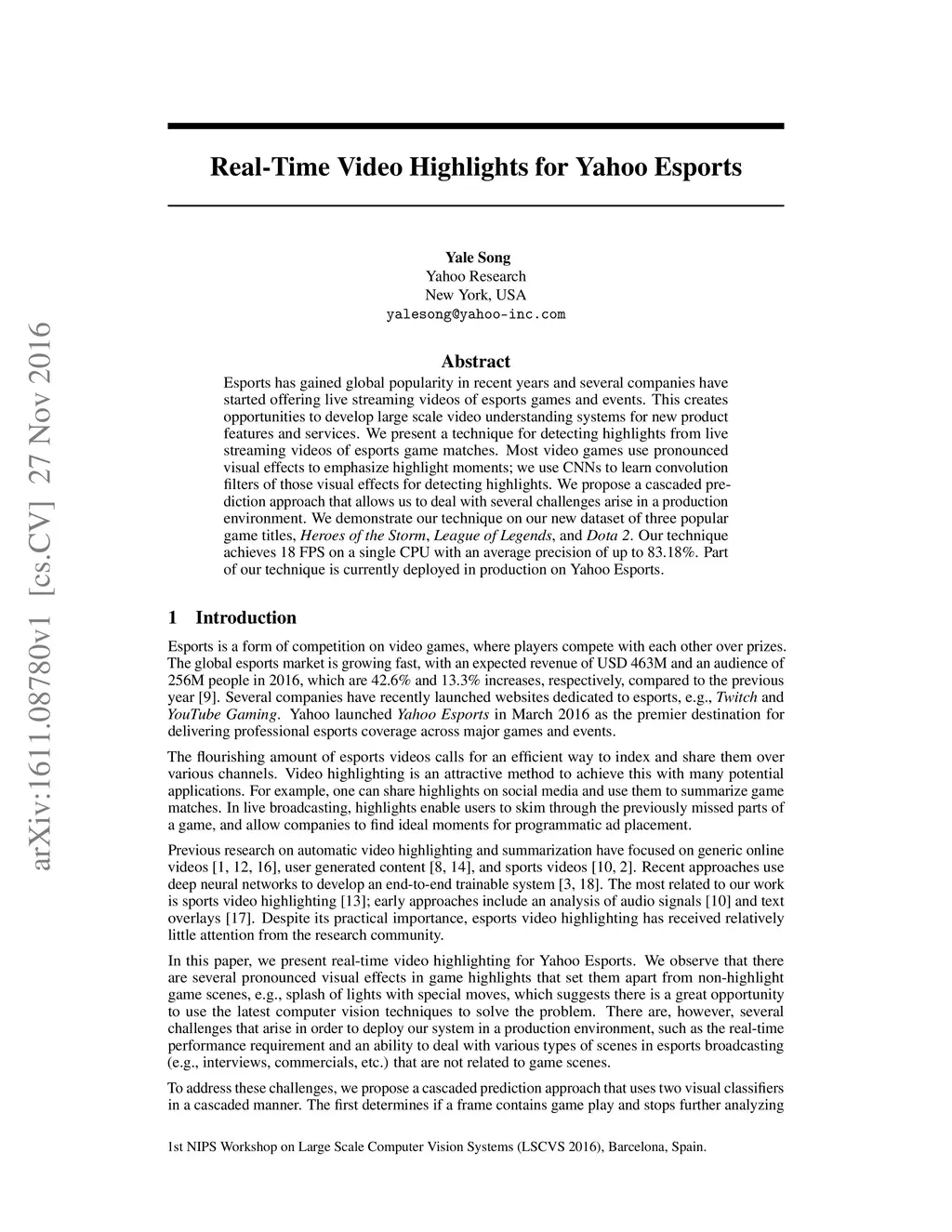 Esports has gained global popularity in recent years and several companies have started offering live streaming videos of esports games and events. This creates opportunities to develop large scale video understanding systems for new product features and services. We present a technique for detecting highlights from live streaming videos of esports game matches. Most video games use pronounced visual effects to emphasize highlight moments; we use CNNs to learn convolution filters of those visual effects for detecting highlights. We propose a cascaded prediction approach that allows us to deal with several challenges arise in a production environment. We demonstrate our technique on our new dataset of three popular game titles, Heroes of the Storm, League of Legends, and Dota 2. Our technique achieves 18 FPS on a single CPU with an average precision of up to 83.18%. Part of our technique is currently deployed in production on Yahoo Esports.