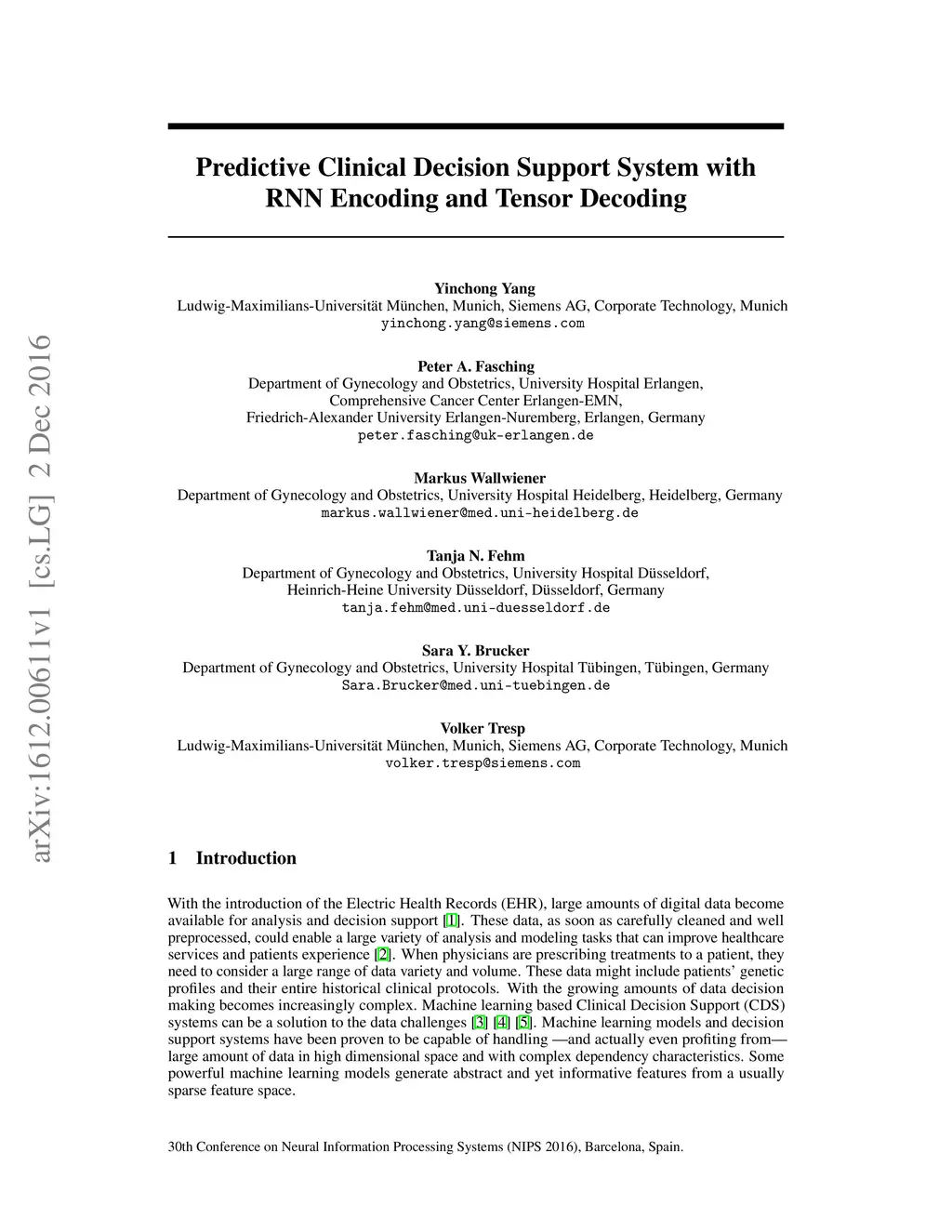 With the introduction of the Electric Health Records, large amounts of digital data become available for analysis and decision support. When physicians are prescribing treatments to a patient, they need to consider a large range of data variety and volume, making decisions increasingly complex. Machine learning based Clinical Decision Support systems can be a solution to the data challenges. In this work we focus on a class of decision support in which the physicians' decision is directly predicted. Concretely, the model would assign higher probabilities to decisions that it presumes the physician are more likely to make. Thus the CDS system can provide physicians with rational recommendations. We also address the problem of correlation in target features: Often a physician is required to make multiple (sub-)decisions in a block, and that these decisions are mutually dependent. We propose a solution to the target correlation problem using a tensor factorization model. In order to handle the patients' historical information as sequential data, we apply the so-called Encoder-Decoder-Framework which is based on Recurrent Neural Networks (RNN) as encoders and a tensor factorization model as a decoder, a combination which is novel in machine learning. With experiments with real-world datasets we show that the proposed model does achieve better prediction performances.