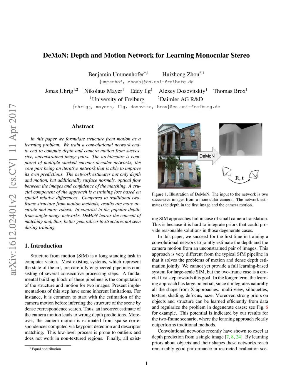 In this paper we formulate structure from motion as a learning problem. We train a convolutional network end-to-end to compute depth and camera motion from successive, unconstrained image pairs. The architecture is composed of multiple stacked encoder-decoder networks, the core part being an iterative network that is able to improve its own predictions. The network estimates not only depth and motion, but additionally surface normals, optical flow between the images and confidence of the matching. A crucial component of the approach is a training loss based on spatial relative differences. Compared to traditional two-frame structure from motion methods, results are more accurate and more robust. In contrast to the popular depth-from-single-image networks, DeMoN learns the concept of matching and, thus, better generalizes to structures not seen during training.