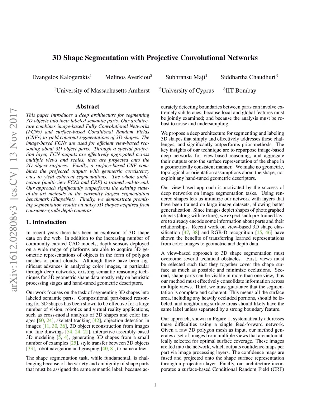 This paper introduces a deep architecture for segmenting 3D objects into their labeled semantic parts. Our architecture combines image-based Fully Convolutional Networks (FCNs) and surface-based Conditional Random Fields (CRFs) to yield coherent segmentations of 3D shapes. The image-based FCNs are used for efficient view-based reasoning about 3D object parts. Through a special projection layer, FCN outputs are effectively aggregated across multiple views and scales, then are projected onto the 3D object surfaces. Finally, a surface-based CRF combines the projected outputs with geometric consistency cues to yield coherent segmentations. The whole architecture (multi-view FCNs and CRF) is trained end-to-end. Our approach significantly outperforms the existing state-of-the-art methods in the currently largest segmentation benchmark (ShapeNet). Finally, we demonstrate promising segmentation results on noisy 3D shapes acquired from consumer-grade depth cameras.