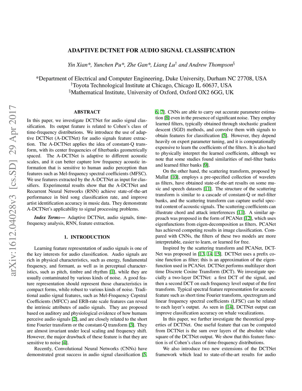 In this paper, we investigate DCTNet for audio signal classification. Its output feature is related to Cohen's class of time-frequency distributions. We introduce the use of adaptive DCTNet (A-DCTNet) for audio signals feature extraction. The A-DCTNet applies the idea of constant-Q transform, with its center frequencies of filterbanks geometrically spaced. The A-DCTNet is adaptive to different acoustic scales, and it can better capture low frequency acoustic information that is sensitive to human audio perception than features such as Mel-frequency spectral coefficients (MFSC). We use features extracted by the A-DCTNet as input for classifiers. Experimental results show that the A-DCTNet and Recurrent Neural Networks (RNN) achieve state-of-the-art performance in bird song classification rate, and improve artist identification accuracy in music data. They demonstrate A-DCTNet's applicability to signal processing problems.