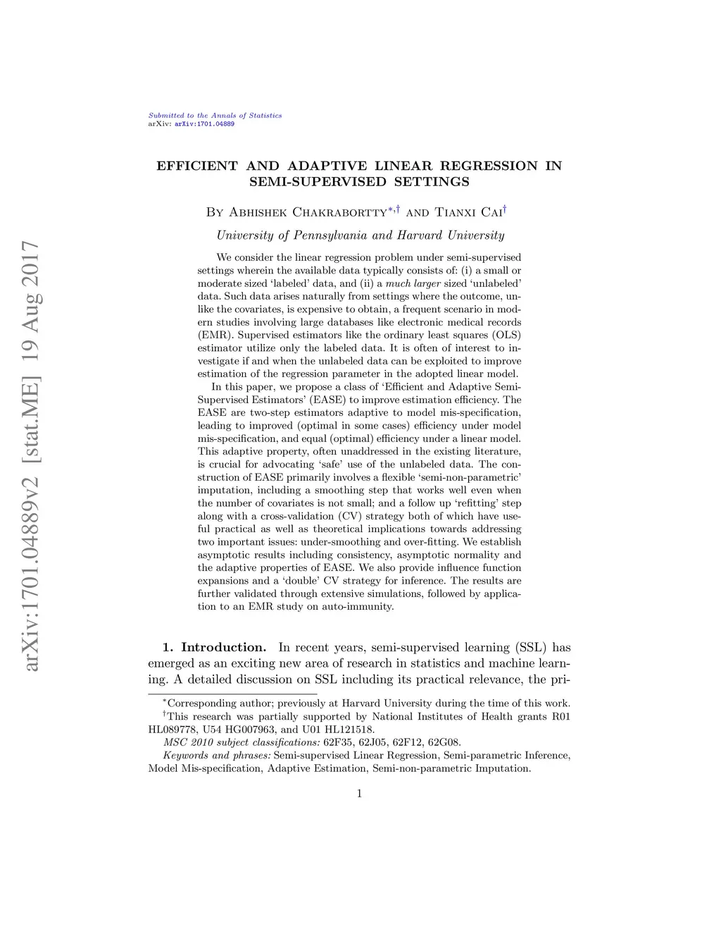 We consider the linear regression problem under semi-supervised settings wherein the available data typically consists of: (i) a small or moderate sized 'labeled' data, and (ii) a much larger sized únlabeled' data. Such data arises naturally from settings where the outcome, unlike the covariates, is expensive to obtain, a frequent scenario in modern studies involving large databases like electronic medical records (EMR). Supervised estimators like the ordinary least squares (OLS) estimator utilize only the labeled data. It is often of interest to investigate if and when the unlabeled data can be exploited to improve estimation of the regression parameter in the adopted linear model. In this paper, we propose a class of Éfficient and Adaptive Semi-Supervised Estimators' (EASE) to improve estimation efficiency. The EASE are two-step estimators adaptive to model mis-specification, leading to improved (optimal in some cases) efficiency under model mis-specification, and equal (optimal) efficiency under a linear model. This adaptive property, often unaddressed in the existing literature, is crucial for advocating 'safe' use of the unlabeled data. The construction of EASE primarily involves a flexible 'semi-non-parametric' imputation, including a smoothing step that works well even when the number of covariates is not small; and a follow up 'refitting' step along with a cross-validation (CV) strategy both of which have useful practical as well as theoretical implications towards addressing two important issues: under-smoothing and over-fitting. We establish asymptotic results including consistency, asymptotic normality and the adaptive properties of EASE. We also provide influence function expansions and a 'double' CV strategy for inference. The results are further validated through extensive simulations, followed by application to an EMR study on auto-immunity.