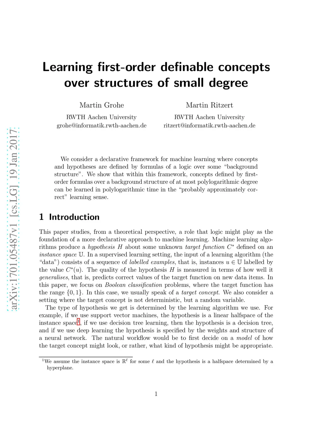 We consider a declarative framework for machine learning where concepts and hypotheses are defined by formulas of a logic over some background structure. We show that within this framework, concepts defined by first-order formulas over a background structure of at most polylogarithmic degree can be learned in polylogarithmic time in the "probably approximately correct" learning sense.