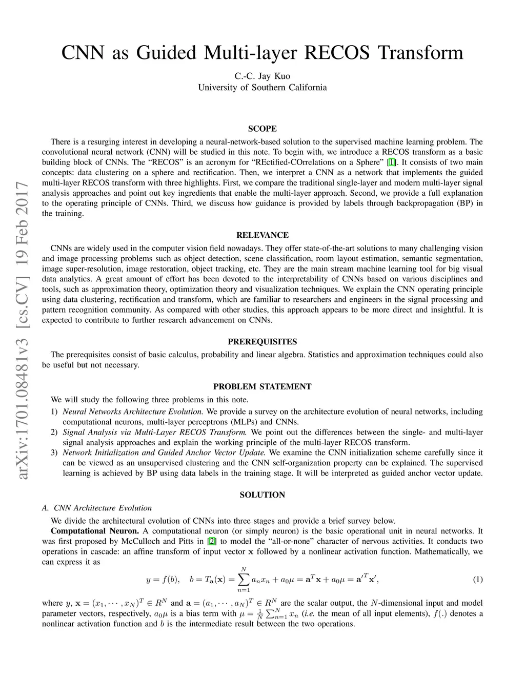 There is a resurging interest in developing a neural-network-based solution to the supervised machine learning problem. The convolutional neural network (CNN) will be studied in this note. To begin with, we introduce a RECOS transform as a basic building block of CNNs. The "RECOS" is an acronym for "REctified-COrrelations on a Sphere". It consists of two main concepts: 1) data clustering on a sphere and 2) rectification. Afterwards, we interpret a CNN as a network that implements the guided multi-layer RECOS transform with three highlights. First, we compare the traditional single-layer and modern multi-layer signal analysis approaches, point out key ingredients that enable the multi-layer approach, and provide a full explanation to the operating principle of CNNs. Second, we discuss how guidance is provided by labels through backpropagation (BP) in the training. Third, we show that a trained network can be greatly simplified in the testing stage demanding only one-bit representation for both filter weights and inputs.