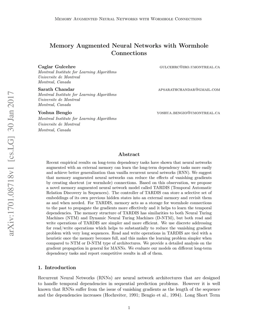 Recent empirical results on long-term dependency tasks have shown that neural networks augmented with an external memory can learn the long-term dependency tasks more easily and achieve better generalization than vanilla recurrent neural networks (RNN). We suggest that memory augmented neural networks can reduce the effects of vanishing gradients by creating shortcut (or wormhole) connections. Based on this observation, we propose a novel memory augmented neural network model called TARDIS (Temporal Automatic Relation Discovery in Sequences). The controller of TARDIS can store a selective set of embeddings of its own previous hidden states into an external memory and revisit them as and when needed. For TARDIS, memory acts as a storage for wormhole connections to the past to propagate the gradients more effectively and it helps to learn the temporal dependencies. The memory structure of TARDIS has similarities to both Neural Turing Machines (NTM) and Dynamic Neural Turing Machines (D-NTM), but both read and write operations of TARDIS are simpler and more efficient. We use discrete addressing for read/write operations which helps to substantially to reduce the vanishing gradient problem with very long sequences. Read and write operations in TARDIS are tied with a heuristic once the memory becomes full, and this makes the learning problem simpler when compared to NTM or D-NTM type of architectures. We provide a detailed analysis on the gradient propagation in general for MANNs. We evaluate our models on different long-term dependency tasks and report competitive results in all of them.