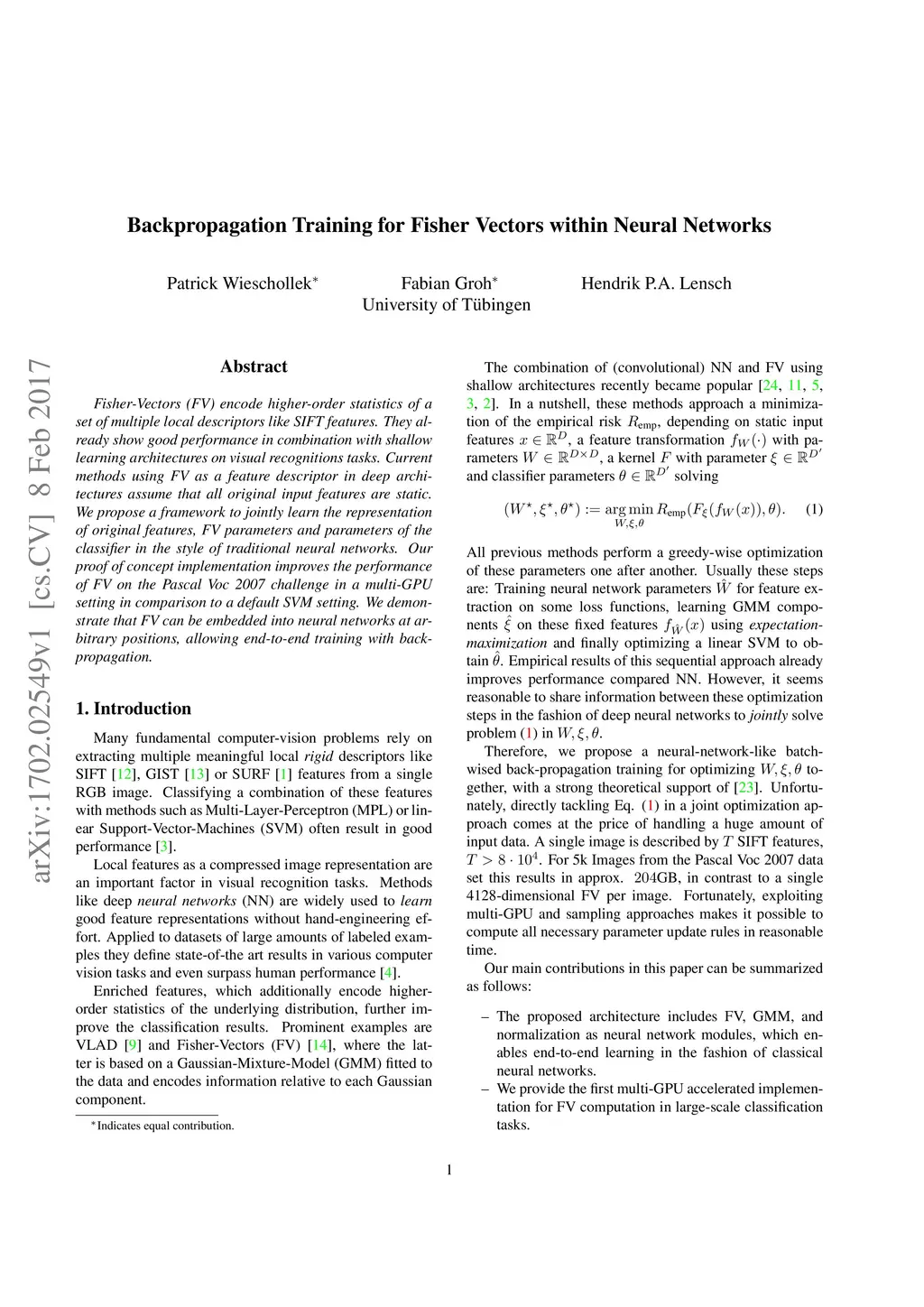 Fisher-Vectors (FV) encode higher-order statistics of a set of multiple local descriptors like SIFT features. They already show good performance in combination with shallow learning architectures on visual recognitions tasks. Current methods using FV as a feature descriptor in deep architectures assume that all original input features are static. We propose a framework to jointly learn the representation of original features, FV parameters and parameters of the classifier in the style of traditional neural networks. Our proof of concept implementation improves the performance of FV on the Pascal Voc 2007 challenge in a multi-GPU setting in comparison to a default SVM setting. We demonstrate that FV can be embedded into neural networks at arbitrary positions, allowing end-to-end training with back-propagation.