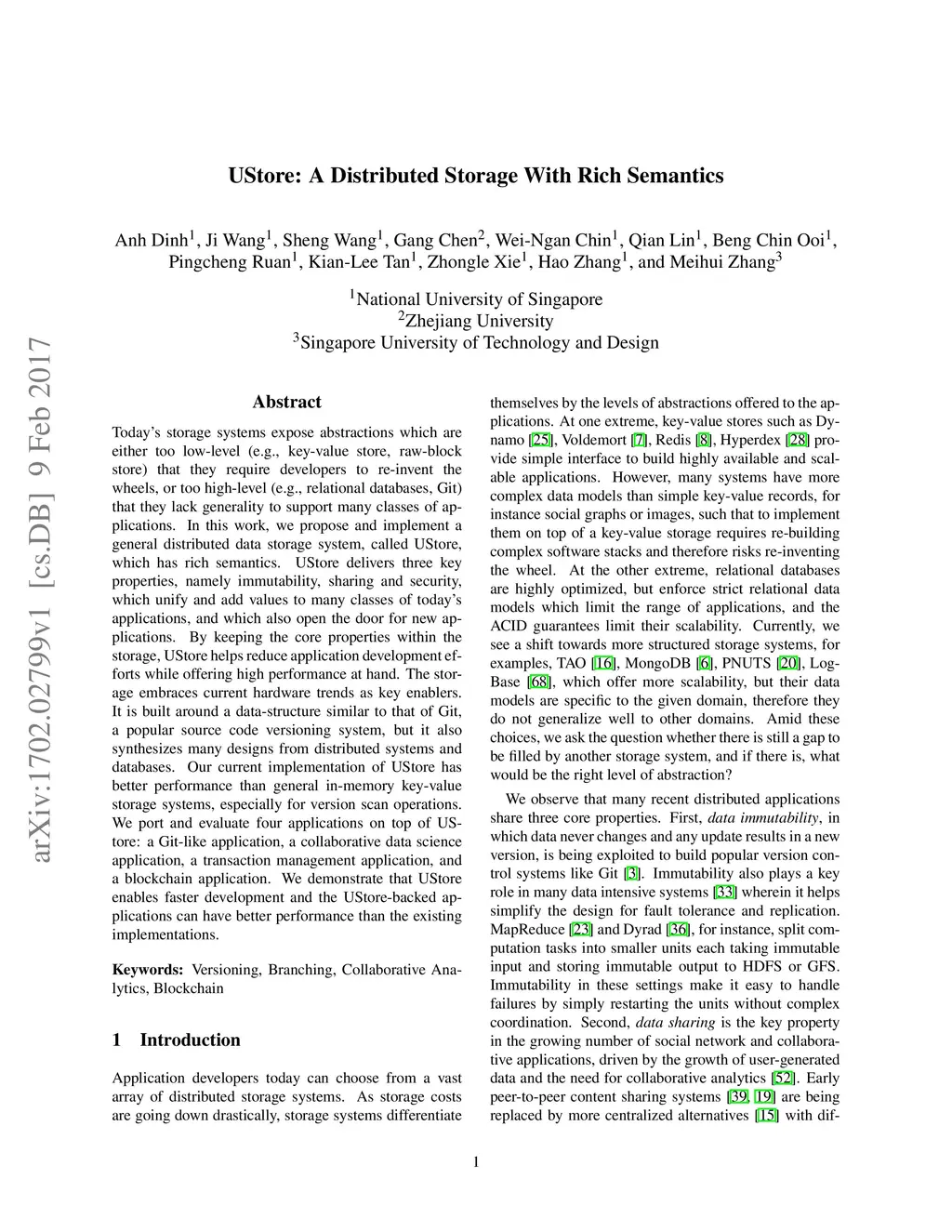 Today's storage systems expose abstractions which are either too low-level (e.g., key-value store, raw-block store) that they require developers to re-invent the wheels, or too high-level (e.g., relational databases, Git) that they lack generality to support many classes of applications. In this work, we propose and implement a general distributed data storage system, called UStore, which has rich semantics. UStore delivers three key properties, namely immutability, sharing and security, which unify and add values to many classes of today's applications, and which also open the door for new applications. By keeping the core properties within the storage, UStore helps reduce application development efforts while offering high performance at hand. The storage embraces current hardware trends as key enablers. It is built around a data-structure similar to that of Git, a popular source code versioning system, but it also synthesizes many designs from distributed systems and databases. Our current implementation of UStore has better performance than general in-memory key-value storage systems, especially for version scan operations. We port and evaluate four applications on top of UStore: a Git-like application, a collaborative data science application, a transaction management application, and a blockchain application. We demonstrate that UStore enables faster development and the UStore-backed applications can have better performance than the existing implementations.
