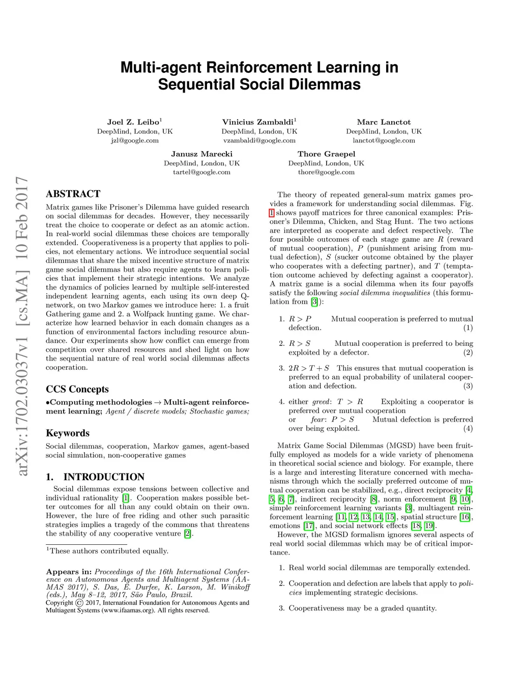 Matrix games like Prisoner's Dilemma have guided research on social dilemmas for decades. However, they necessarily treat the choice to cooperate or defect as an atomic action. In real-world social dilemmas these choices are temporally extended. Cooperativeness is a property that applies to policies, not elementary actions. We introduce sequential social dilemmas that share the mixed incentive structure of matrix game social dilemmas but also require agents to learn policies that implement their strategic intentions. We analyze the dynamics of policies learned by multiple self-interested independent learning agents, each using its own deep Q-network, on two Markov games we introduce here: 1. a fruit Gathering game and 2. a Wolfpack hunting game. We characterize how learned behavior in each domain changes as a function of environmental factors including resource abundance. Our experiments show how conflict can emerge from competition over shared resources and shed light on how the sequential nature of real world social dilemmas affects cooperation.