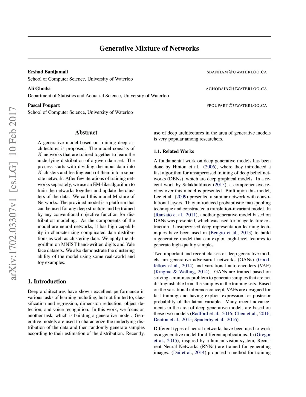 A generative model based on training deep architectures is proposed. The model consists of K networks that are trained together to learn the underlying distribution of a given data set. The process starts with dividing the input data into K clusters and feeding each of them into a separate network. After few iterations of training networks separately, we use an EM-like algorithm to train the networks together and update the clusters of the data. We call this model Mixture of Networks. The provided model is a platform that can be used for any deep structure and be trained by any conventional objective function for distribution modeling. As the components of the model are neural networks, it has high capability in characterizing complicated data distributions as well as clustering data. We apply the algorithm on MNIST hand-written digits and Yale face datasets. We also demonstrate the clustering ability of the model using some real-world and toy examples.