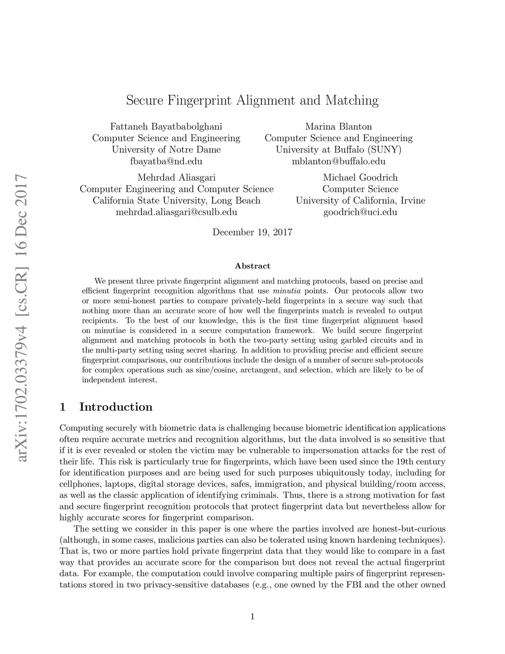 We present three private fingerprint alignment and matching protocols, based on what are considered to be the most precise and efficient fingerprint recognition algorithms, which use minutia points. Our protocols allow two or more honest-but-curious parties to compare their respective privately-held fingerprints in a secure way such that they each learn nothing more than an accurate score of how well the fingerprints match. To the best of our knowledge, this is the first time fingerprint alignment based on minutiae is considered in a secure computation framework. We build secure fingerprint alignment and matching protocols in both the two-party setting using garbled circuit evaluation and in the multi-party setting using secret sharing techniques. In addition to providing precise and efficient secure fingerprint alignment and matching, our contributions include the design of a number of secure sub-protocols for complex operations such as sine, cosine, arctangent, square root, and selection, which are likely to be of independent interest.