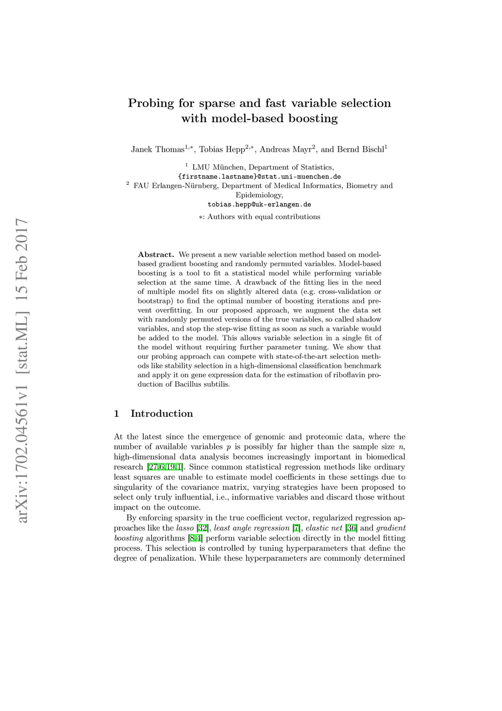 We present a new variable selection method based on model-based gradient boosting and randomly permuted variables. Model-based boosting is a tool to fit a statistical model while performing variable selection at the same time. A drawback of the fitting lies in the need of multiple model fits on slightly altered data (e.g. cross-validation or bootstrap) to find the optimal number of boosting iterations and prevent overfitting. In our proposed approach, we augment the data set with randomly permuted versions of the true variables, so called shadow variables, and stop the step-wise fitting as soon as such a variable would be added to the model. This allows variable selection in a single fit of the model without requiring further parameter tuning. We show that our probing approach can compete with state-of-the-art selection methods like stability selection in a high-dimensional classification benchmark and apply it on gene expression data for the estimation of riboflavin production of Bacillus subtilis.