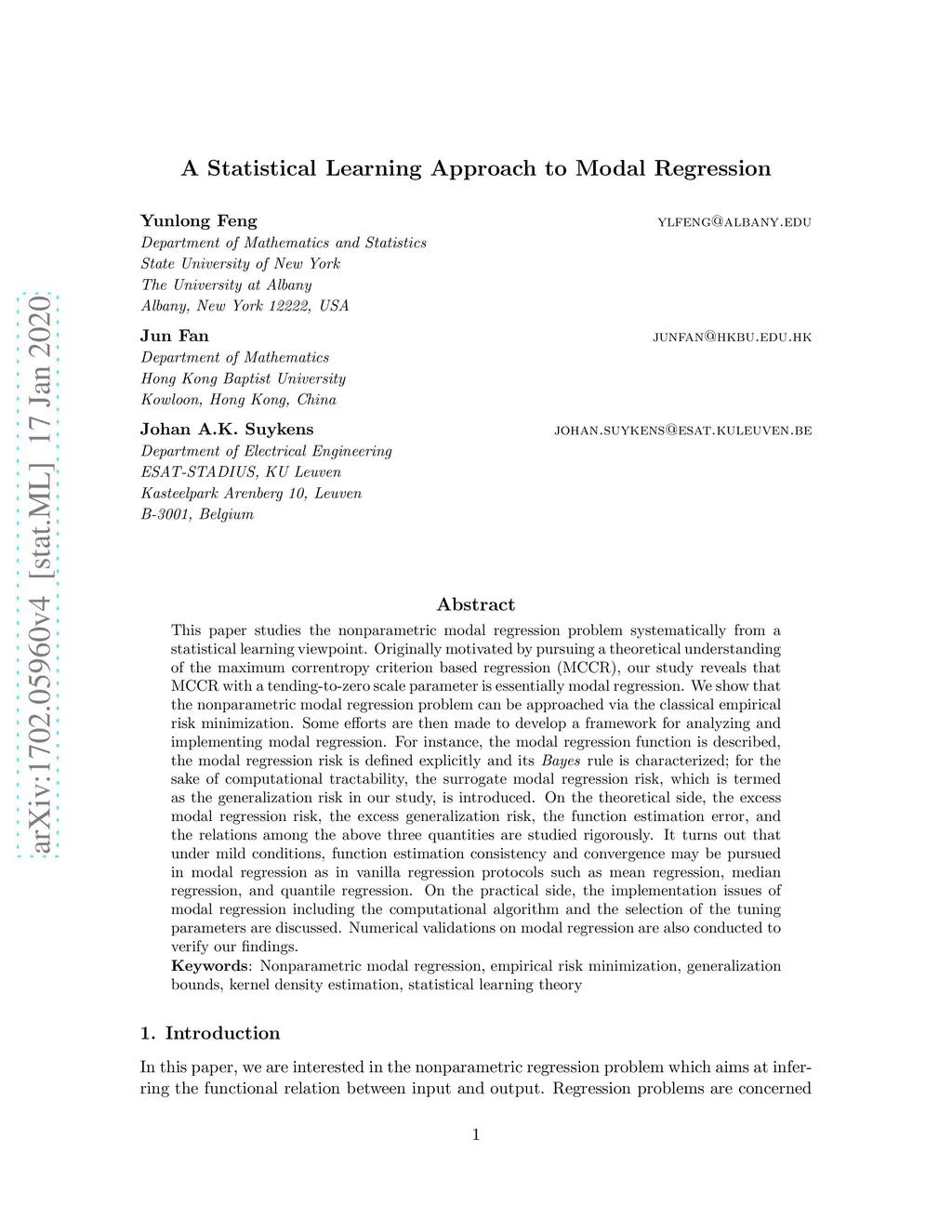 This paper studies the nonparametric modal regression problem systematically from a statistical learning view. Originally motivated by pursuing a theoretical understanding of the maximum correntropy criterion based regression (MCCR), our study reveals that MCCR with a tending-to-zero scale parameter is essentially modal regression. We show that nonparametric modal regression problem can be approached via the classical empirical risk minimization. Some efforts are then made to develop a framework for analyzing and implementing modal regression. For instance, the modal regression function is described, the modal regression risk is defined explicitly and its \textit{Bayes} rule is characterized; for the sake of computational tractability, the surrogate modal regression risk, which is termed as the generalization risk in our study, is introduced. On the theoretical side, the excess modal regression risk, the excess generalization risk, the function estimation error, and the relations among the above three quantities are studied rigorously. It turns out that under mild conditions, function estimation consistency and convergence may be pursued in modal regression as in vanilla regression protocols, such as mean regression, median regression, and quantile regression. However, it outperforms these regression models in terms of robustness as shown in our study from a re-descending M-estimation view. This coincides with and in return explains the merits of MCCR on robustness. On the practical side, the implementation issues of modal regression including the computational algorithm and the tuning parameters selection are discussed. Numerical assessments on modal regression are also conducted to verify our findings empirically.