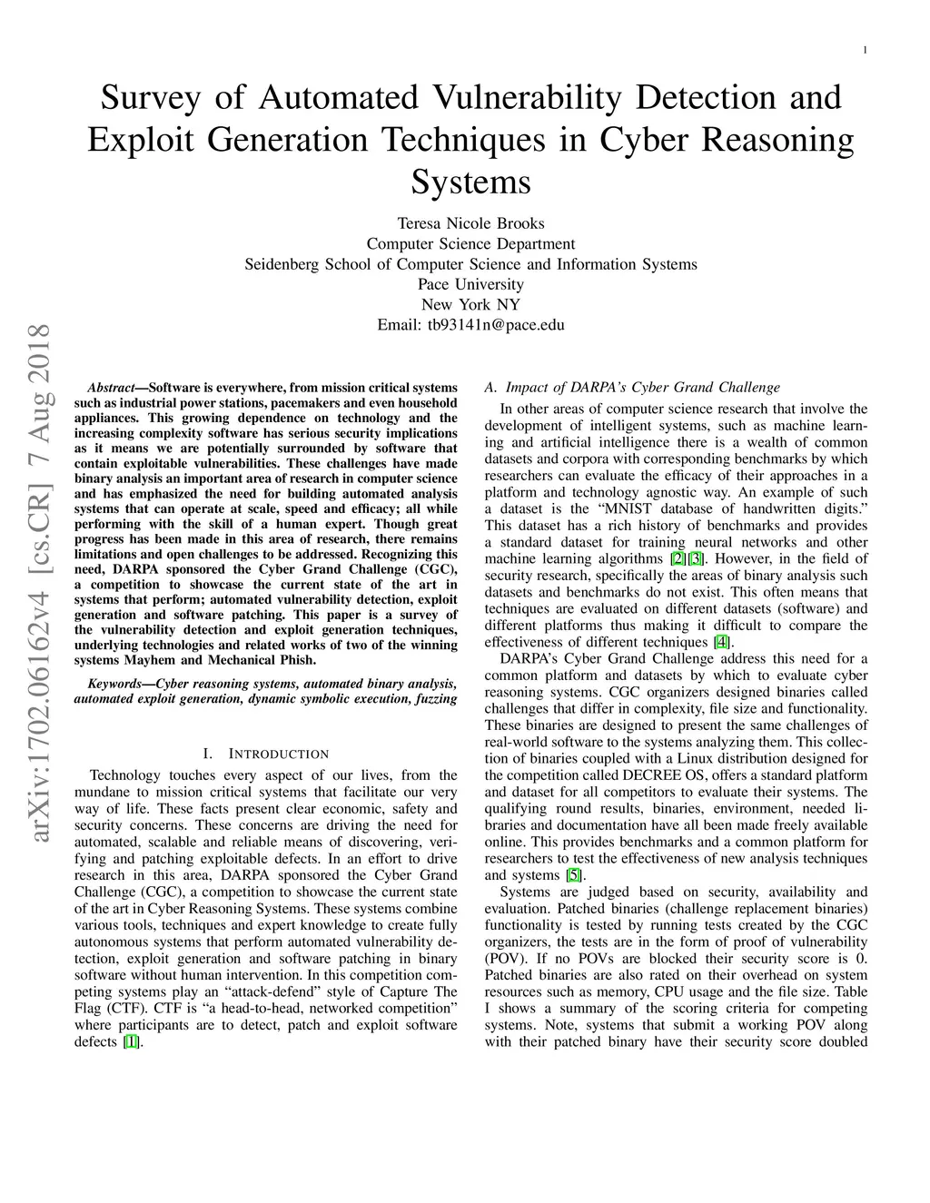 Software is everywhere, from mission critical systems such as industrial power stations, pacemakers and even household appliances. This growing dependence on technology and the increasing complexity software has serious security implications as it means we are potentially surrounded by software that contain exploitable vulnerabilities. These challenges have made binary analysis an important area of research in computer science and has emphasized the need for building automated analysis systems that can operate at scale, speed and efficacy; all while performing with the skill of a human expert. Though great progress has been made in this area of research, there remains limitations and open challenges to be addressed. Recognizing this need, DARPA sponsored the Cyber Grand Challenge (CGC), a competition to showcase the current state of the art in systems that perform; automated vulnerability detection, exploit generation and software patching. This paper is a survey of the vulnerability detection and exploit generation techniques, underlying technologies and related works of two of the winning systems Mayhem and Mechanical Phish.