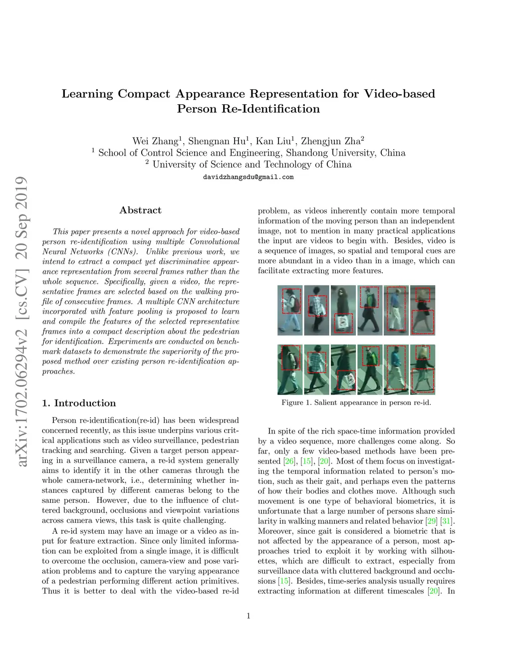 This paper presents a novel approach for video-based person re-identification using multiple Convolutional Neural Networks (CNNs). Unlike previous work, we intend to extract a compact yet discriminative appearance representation from several frames rather than the whole sequence. Specifically, given a video, the representative frames are selected based on the walking profile of consecutive frames. A multiple CNN architecture incorporated with feature pooling is proposed to learn and compile the features of the selected representative frames into a compact description about the pedestrian for identification. Experiments are conducted on benchmark datasets to demonstrate the superiority of the proposed method over existing person re-identification approaches.