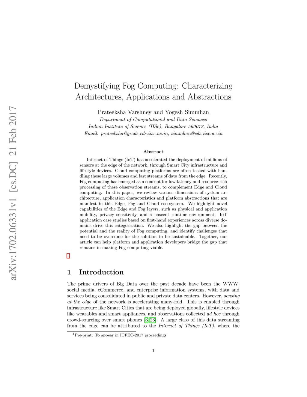 Internet of Things (IoT) has accelerated the deployment of millions of sensors at the edge of the network, through Smart City infrastructure and lifestyle devices. Cloud computing platforms are often tasked with handling these large volumes and fast streams of data from the edge. Recently, Fog computing has emerged as a concept for low-latency and resource-rich processing of these observation streams, to complement Edge and Cloud computing. In this paper, we review various dimensions of system architecture, application characteristics and platform abstractions that are manifest in this Edge, Fog and Cloud eco-system. We highlight novel capabilities of the Edge and Fog layers, such as physical and application mobility, privacy sensitivity, and a nascent runtime environment. IoT application case studies based on first-hand experiences across diverse domains drive this categorization. We also highlight the gap between the potential and the reality of Fog computing, and identify challenges that need to be overcome for the solution to be sustainable. Together, our article can help platform and application developers bridge the gap that remains in making Fog computing viable.
