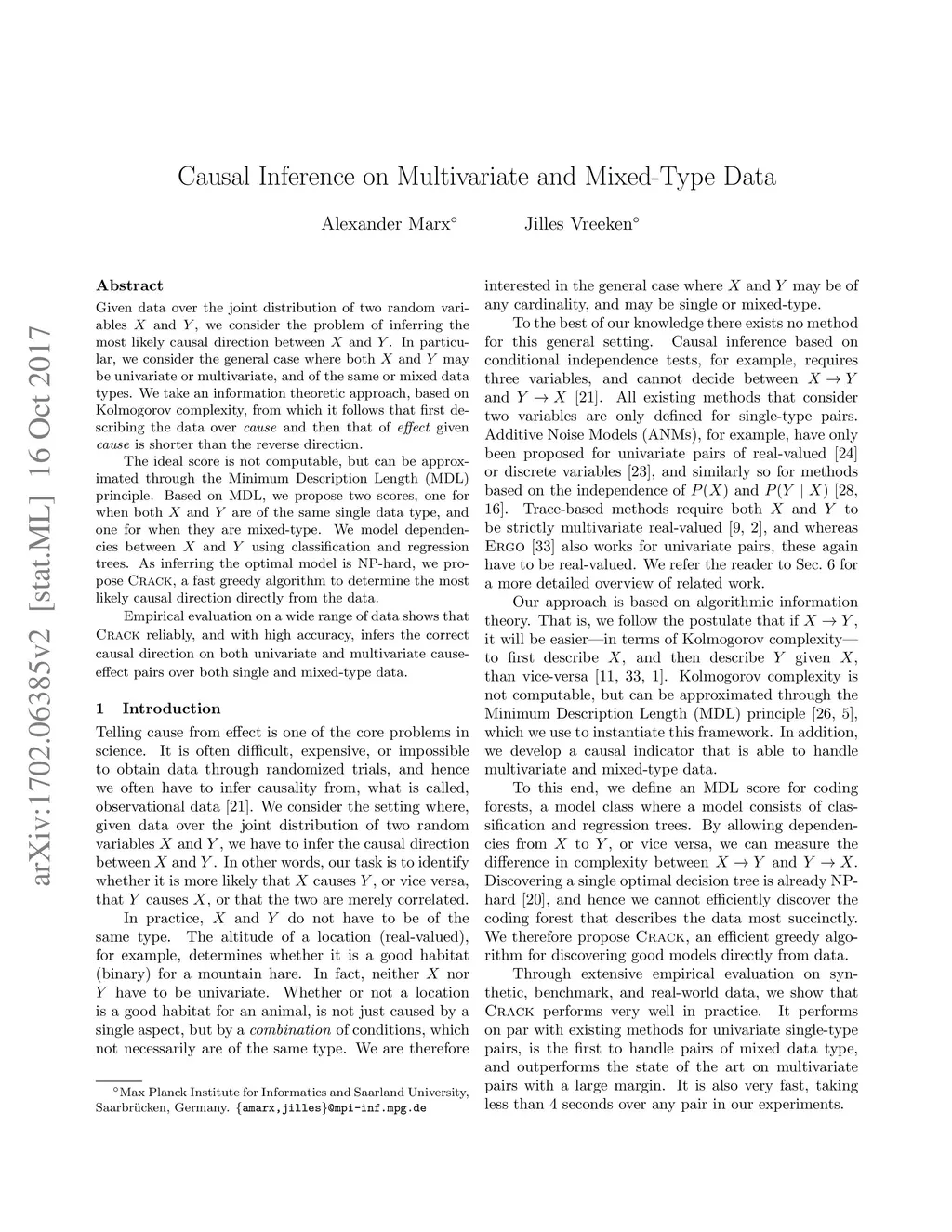 Given data over the joint distribution of two random variables and , we consider the problem of inferring the most likely causal direction between and . In particular, we consider the general case where both and may be univariate or multivariate, and of the same or mixed data types. We take an information theoretic approach, based on Kolmogorov complexity, from which it follows that first describing the data over cause and then that of effect given cause is shorter than the reverse direction. The ideal score is not computable, but can be approximated through the Minimum Description Length (MDL) principle. Based on MDL, we propose two scores, one for when both and are of the same single data type, and one for when they are mixed-type. We model dependencies between and using classification and regression trees. As inferring the optimal model is NP-hard, we propose Crack, a fast greedy algorithm to determine the most likely causal direction directly from the data. Empirical evaluation on a wide range of data shows that Crack reliably, and with high accuracy, infers the correct causal direction on both univariate and multivariate cause-effect pairs over both single and mixed-type data.
