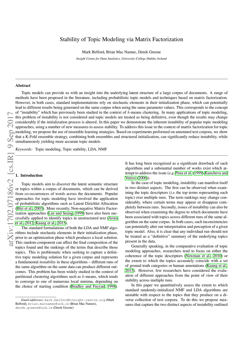 Topic models can provide us with an insight into the underlying latent structure of a large corpus of documents. A range of methods have been proposed in the literature, including probabilistic topic models and techniques based on matrix factorization. However, in both cases, standard implementations rely on stochastic elements in their initialization phase, which can potentially lead to different results being generated on the same corpus when using the same parameter values. This corresponds to the concept of "instability" which has previously been studied in the context of -means clustering. In many applications of topic modeling, this problem of instability is not considered and topic models are treated as being definitive, even though the results may change considerably if the initialization process is altered. In this paper we demonstrate the inherent instability of popular topic modeling approaches, using a number of new measures to assess stability. To address this issue in the context of matrix factorization for topic modeling, we propose the use of ensemble learning strategies. Based on experiments performed on annotated text corpora, we show that a K-Fold ensemble strategy, combining both ensembles and structured initialization, can significantly reduce instability, while simultaneously yielding more accurate topic models.
