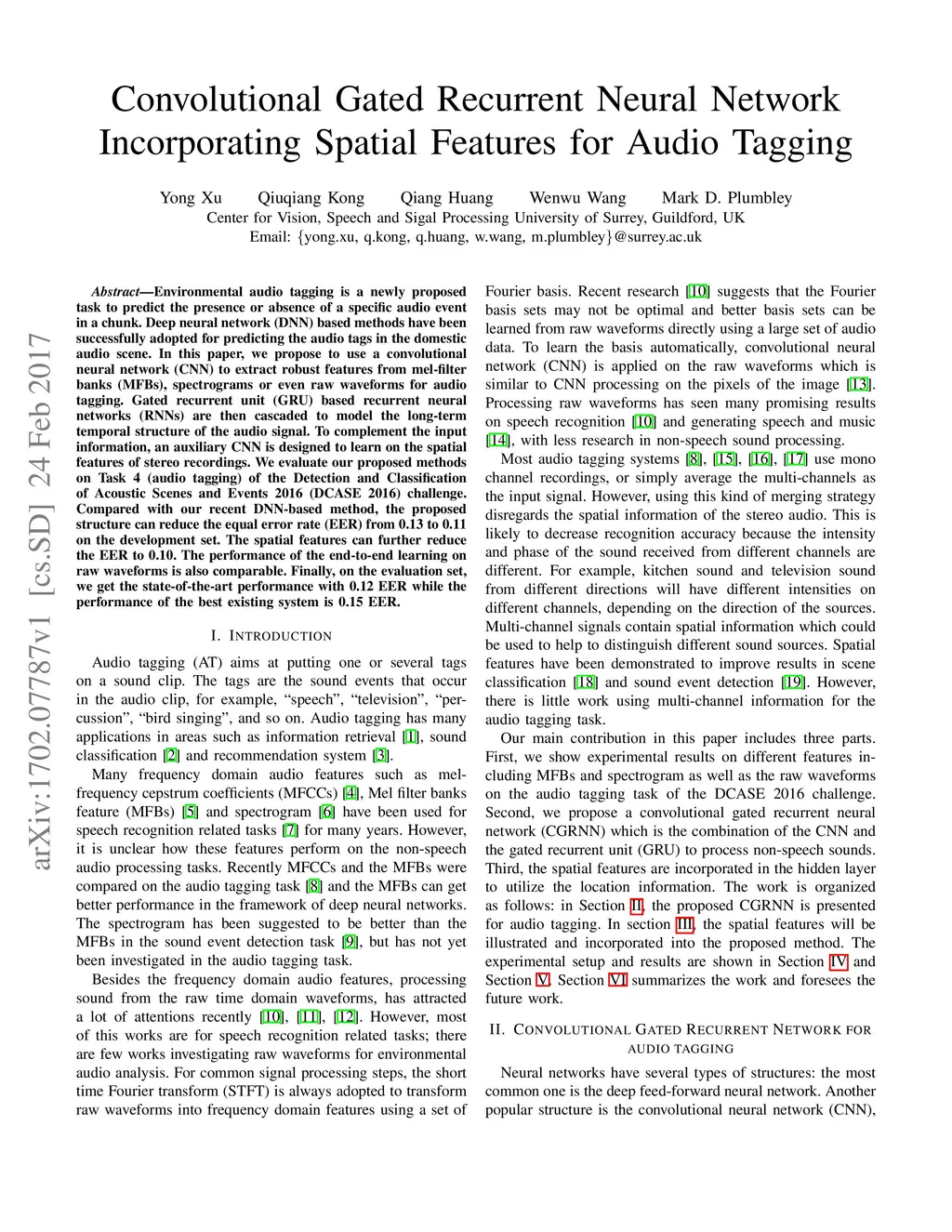 Environmental audio tagging is a newly proposed task to predict the presence or absence of a specific audio event in a chunk. Deep neural network (DNN) based methods have been successfully adopted for predicting the audio tags in the domestic audio scene. In this paper, we propose to use a convolutional neural network (CNN) to extract robust features from mel-filter banks (MFBs), spectrograms or even raw waveforms for audio tagging. Gated recurrent unit (GRU) based recurrent neural networks (RNNs) are then cascaded to model the long-term temporal structure of the audio signal. To complement the input information, an auxiliary CNN is designed to learn on the spatial features of stereo recordings. We evaluate our proposed methods on Task 4 (audio tagging) of the Detection and Classification of Acoustic Scenes and Events 2016 (DCASE 2016) challenge. Compared with our recent DNN-based method, the proposed structure can reduce the equal error rate (EER) from 0.13 to 0.11 on the development set. The spatial features can further reduce the EER to 0.10. The performance of the end-to-end learning on raw waveforms is also comparable. Finally, on the evaluation set, we get the state-of-the-art performance with 0.12 EER while the performance of the best existing system is 0.15 EER.