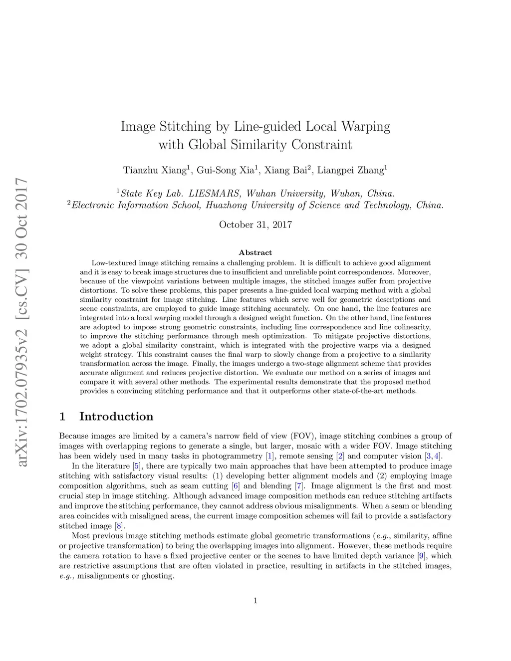 Low-textured image stitching remains a challenging problem. It is difficult to achieve good alignment and it is easy to break image structures due to insufficient and unreliable point correspondences. Moreover, because of the viewpoint variations between multiple images, the stitched images suffer from projective distortions. To solve these problems, this paper presents a line-guided local warping method with a global similarity constraint for image stitching. Line features which serve well for geometric descriptions and scene constraints, are employed to guide image stitching accurately. On one hand, the line features are integrated into a local warping model through a designed weight function. On the other hand, line features are adopted to impose strong geometric constraints, including line correspondence and line colinearity, to improve the stitching performance through mesh optimization. To mitigate projective distortions, we adopt a global similarity constraint, which is integrated with the projective warps via a designed weight strategy. This constraint causes the final warp to slowly change from a projective to a similarity transformation across the image. Finally, the images undergo a two-stage alignment scheme that provides accurate alignment and reduces projective distortion. We evaluate our method on a series of images and compare it with several other methods. The experimental results demonstrate that the proposed method provides a convincing stitching performance and that it outperforms other state-of-the-art methods.
