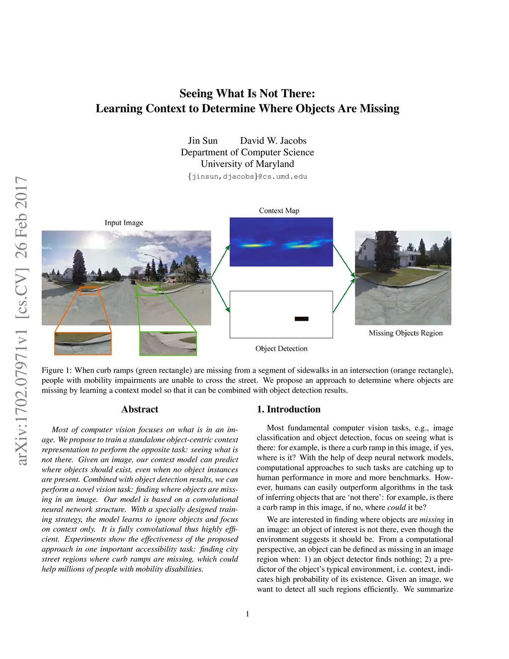 Most of computer vision focuses on what is in an image. We propose to train a standalone object-centric context representation to perform the opposite task: seeing what is not there. Given an image, our context model can predict where objects should exist, even when no object instances are present. Combined with object detection results, we can perform a novel vision task: finding where objects are missing in an image. Our model is based on a convolutional neural network structure. With a specially designed training strategy, the model learns to ignore objects and focus on context only. It is fully convolutional thus highly efficient. Experiments show the effectiveness of the proposed approach in one important accessibility task: finding city street regions where curb ramps are missing, which could help millions of people with mobility disabilities.