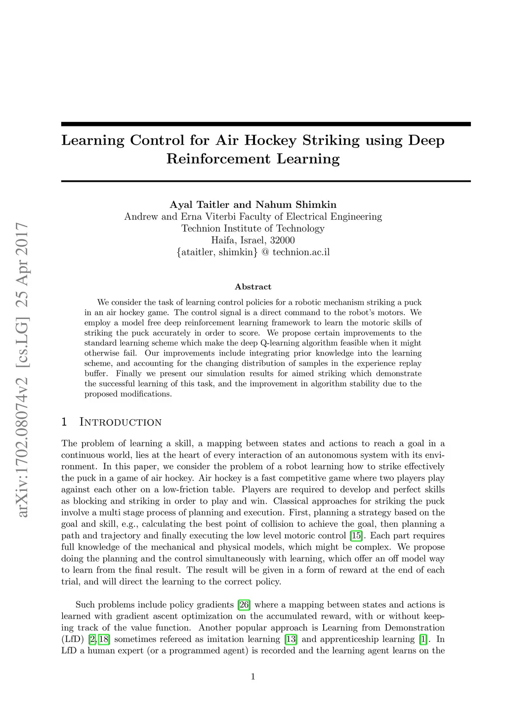 We consider the task of learning control policies for a robotic mechanism striking a puck in an air hockey game. The control signal is a direct command to the robot's motors. We employ a model free deep reinforcement learning framework to learn the motoric skills of striking the puck accurately in order to score. We propose certain improvements to the standard learning scheme which make the deep Q-learning algorithm feasible when it might otherwise fail. Our improvements include integrating prior knowledge into the learning scheme, and accounting for the changing distribution of samples in the experience replay buffer. Finally we present our simulation results for aimed striking which demonstrate the successful learning of this task, and the improvement in algorithm stability due to the proposed modifications.