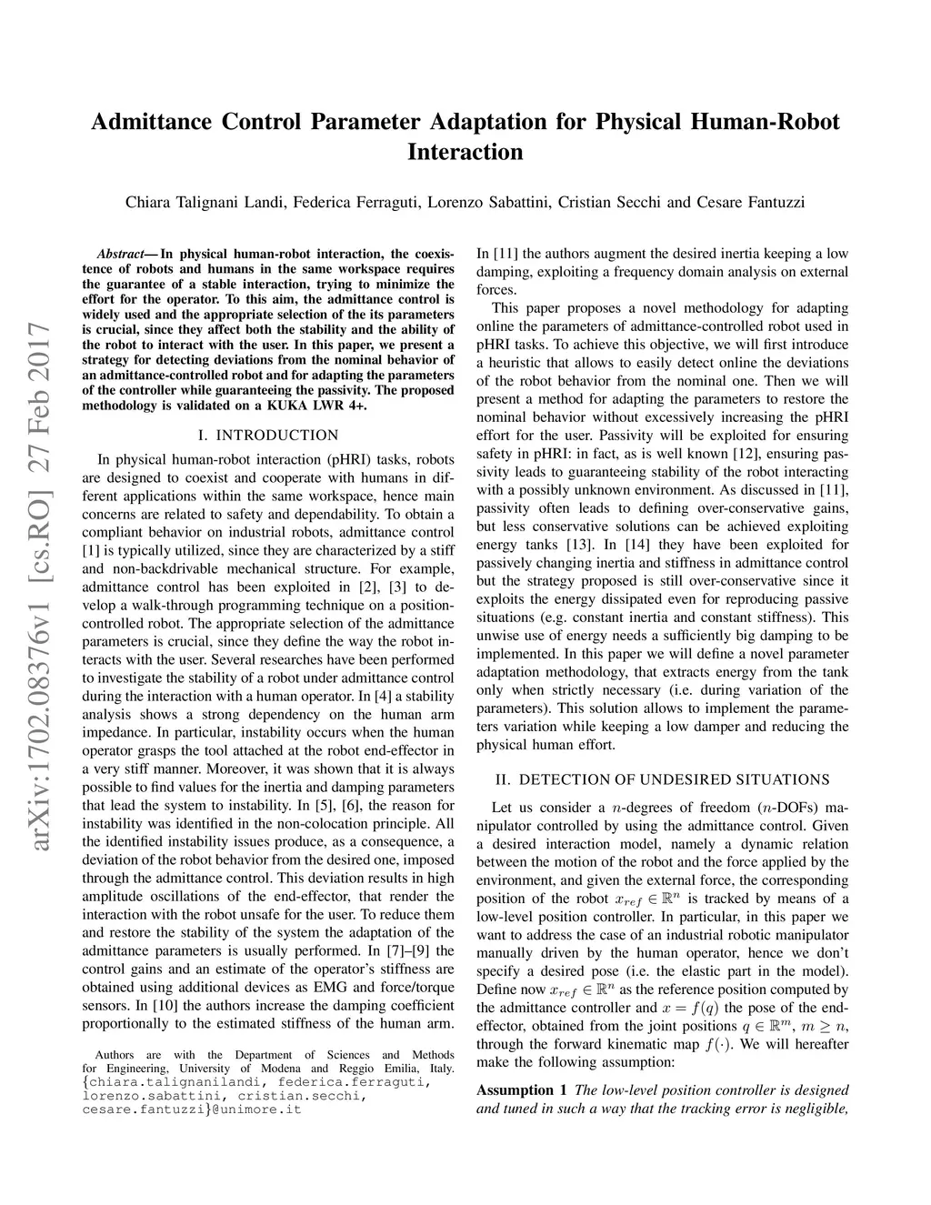 In physical human-robot interaction, the coexistence of robots and humans in the same workspace requires the guarantee of a stable interaction, trying to minimize the effort for the operator. To this aim, the admittance control is widely used and the appropriate selection of the its parameters is crucial, since they affect both the stability and the ability of the robot to interact with the user. In this paper, we present a strategy for detecting deviations from the nominal behavior of an admittance-controlled robot and for adapting the parameters of the controller while guaranteeing the passivity. The proposed methodology is validated on a KUKA LWR 4+.