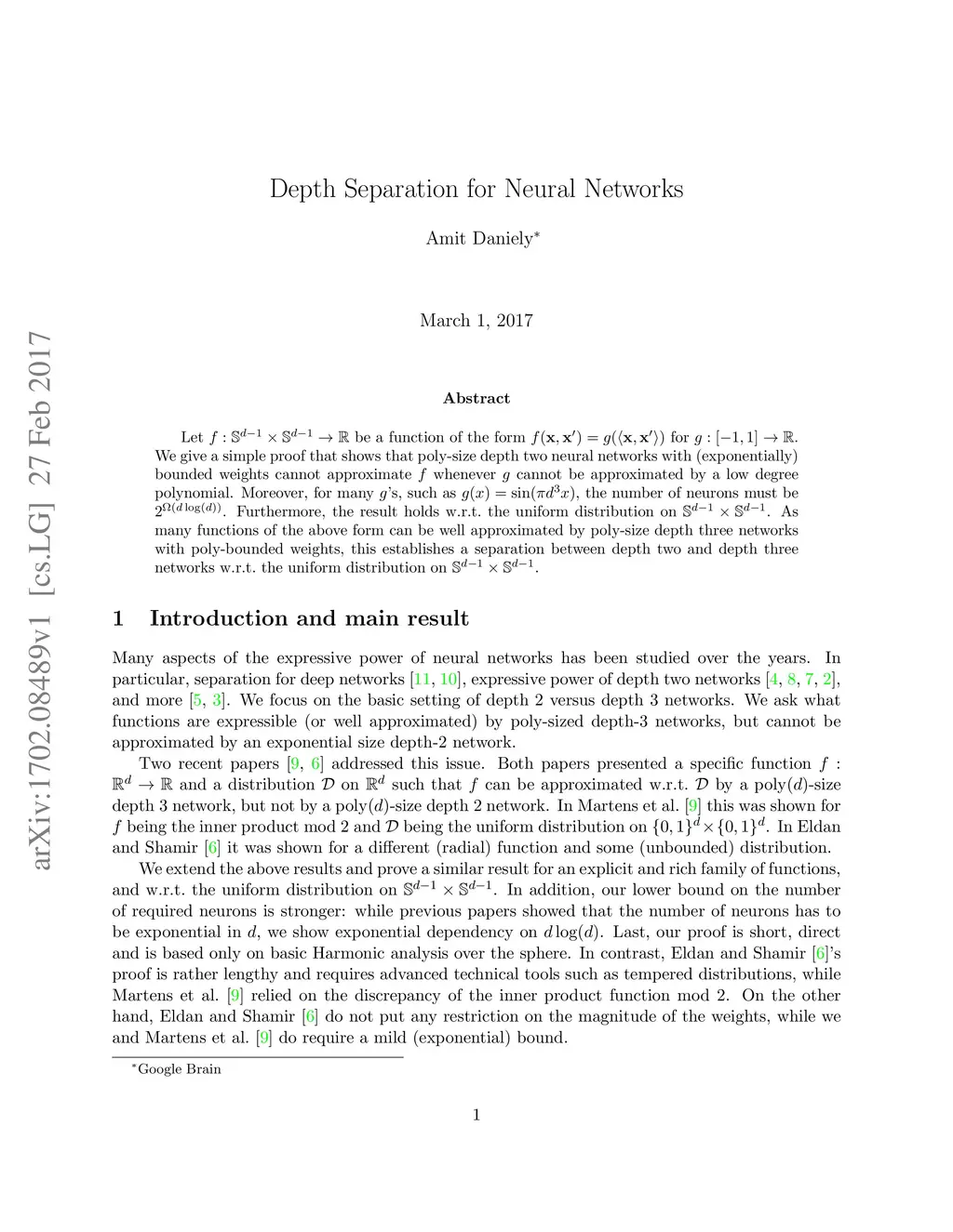 Let be a function of the form for . We give a simple proof that shows that poly-size depth two neural networks with (exponentially) bounded weights cannot approximate whenever cannot be approximated by a low degree polynomial. Moreover, for many 's, such as , the number of neurons must be . Furthermore, the result holds w.r.t.\ the uniform distribution on . As many functions of the above form can be well approximated by poly-size depth three networks with poly-bounded weights, this establishes a separation between depth two and depth three networks w.r.t.\ the uniform distribution on .