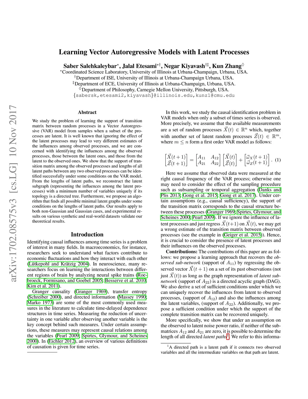 We study the problem of learning the support of transition matrix between random processes in a Vector Autoregressive (VAR) model from samples when a subset of the processes are latent. It is well known that ignoring the effect of the latent processes may lead to very different estimates of the influences among observed processes, and we are concerned with identifying the influences among the observed processes, those between the latent ones, and those from the latent to the observed ones. We show that the support of transition matrix among the observed processes and lengths of all latent paths between any two observed processes can be identified successfully under some conditions on the VAR model. From the lengths of latent paths, we reconstruct the latent subgraph (representing the influences among the latent processes) with a minimum number of variables uniquely if its topology is a directed tree. Furthermore, we propose an algorithm that finds all possible minimal latent graphs under some conditions on the lengths of latent paths. Our results apply to both non-Gaussian and Gaussian cases, and experimental results on various synthetic and real-world datasets validate our theoretical results.