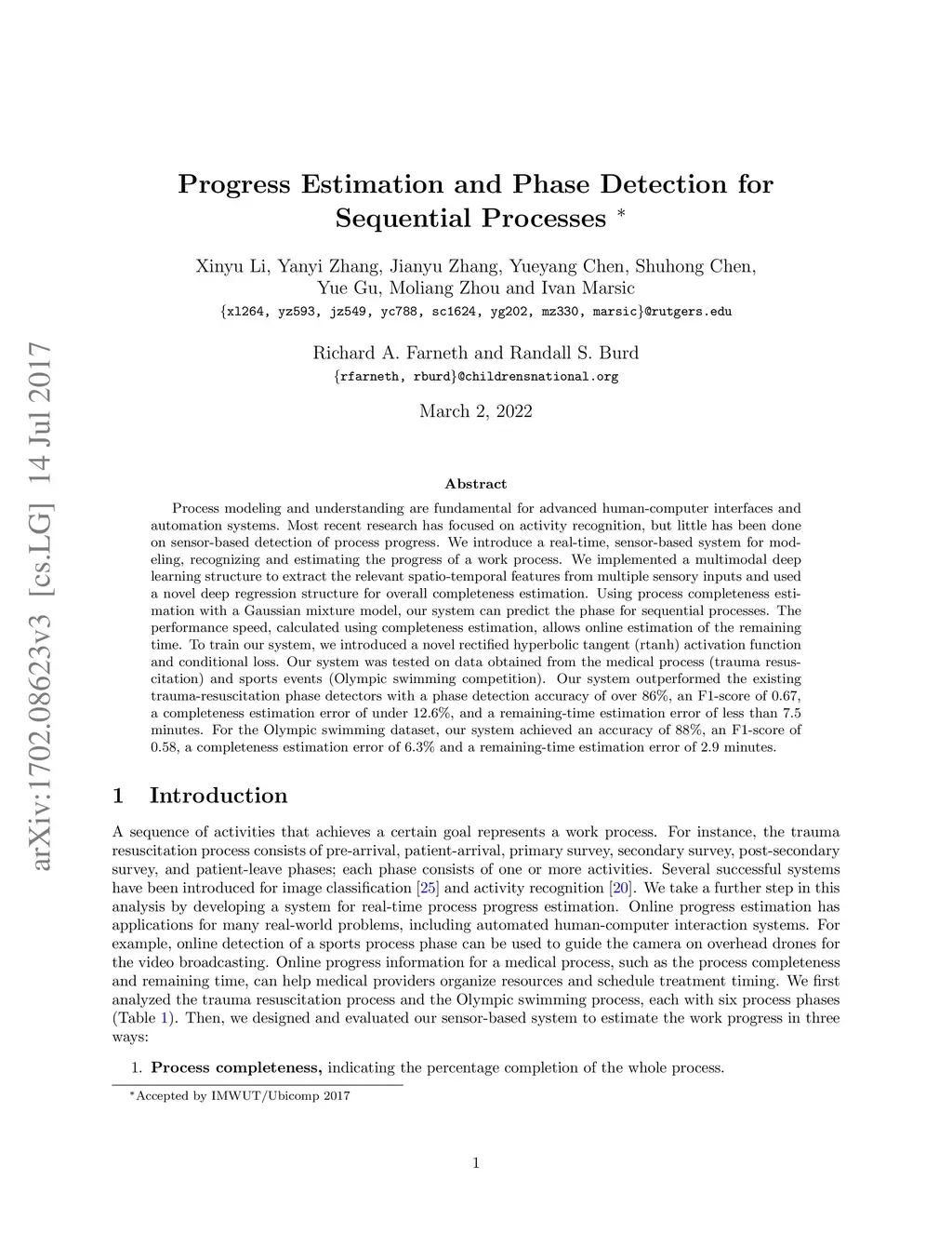 Process modeling and understanding are fundamental for advanced human-computer interfaces and automation systems. Most recent research has focused on activity recognition, but little has been done on sensor-based detection of process progress. We introduce a real-time, sensor-based system for modeling, recognizing and estimating the progress of a work process. We implemented a multimodal deep learning structure to extract the relevant spatio-temporal features from multiple sensory inputs and used a novel deep regression structure for overall completeness estimation. Using process completeness estimation with a Gaussian mixture model, our system can predict the phase for sequential processes. The performance speed, calculated using completeness estimation, allows online estimation of the remaining time. To train our system, we introduced a novel rectified hyperbolic tangent (rtanh) activation function and conditional loss. Our system was tested on data obtained from the medical process (trauma resuscitation) and sports events (Olympic swimming competition). Our system outperformed the existing trauma-resuscitation phase detectors with a phase detection accuracy of over 86%, an F1-score of 0.67, a completeness estimation error of under 12.6%, and a remaining-time estimation error of less than 7.5 minutes. For the Olympic swimming dataset, our system achieved an accuracy of 88%, an F1-score of 0.58, a completeness estimation error of 6.3% and a remaining-time estimation error of 2.9 minutes.