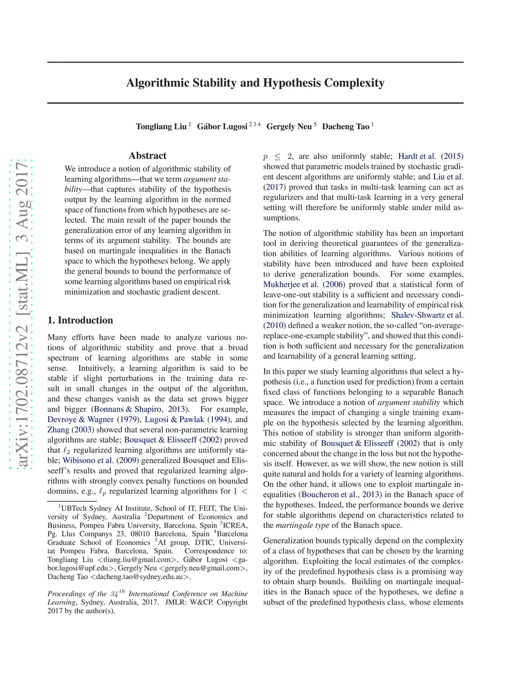 Algorithmic stability and hypothesis complexity