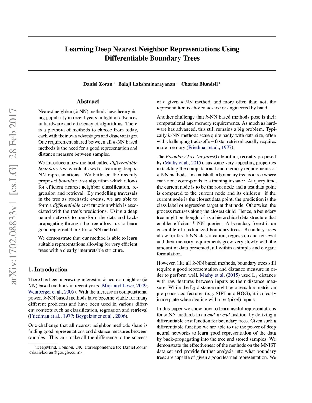 Nearest neighbor (kNN) methods have been gaining popularity in recent years in light of advances in hardware and efficiency of algorithms. There is a plethora of methods to choose from today, each with their own advantages and disadvantages. One requirement shared between all kNN based methods is the need for a good representation and distance measure between samples. We introduce a new method called differentiable boundary tree which allows for learning deep kNN representations. We build on the recently proposed boundary tree algorithm which allows for efficient nearest neighbor classification, regression and retrieval. By modelling traversals in the tree as stochastic events, we are able to form a differentiable cost function which is associated with the tree's predictions. Using a deep neural network to transform the data and back-propagating through the tree allows us to learn good representations for kNN methods. We demonstrate that our method is able to learn suitable representations allowing for very efficient trees with a clearly interpretable structure.