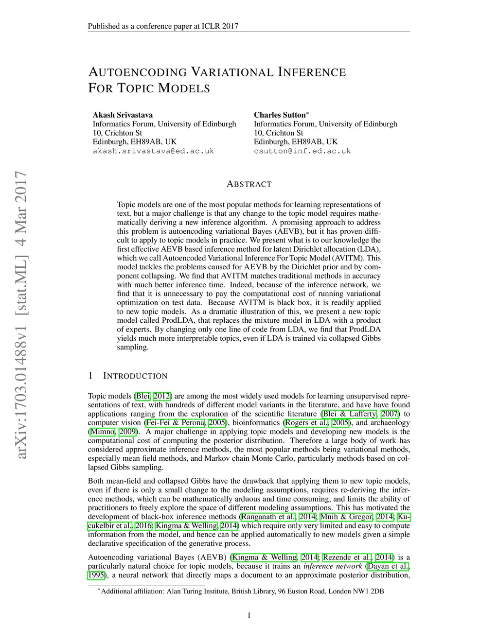 Topic models are one of the most popular methods for learning representations of text, but a major challenge is that any change to the topic model requires mathematically deriving a new inference algorithm. A promising approach to address this problem is autoencoding variational Bayes (AEVB), but it has proven diffi- cult to apply to topic models in practice. We present what is to our knowledge the first effective AEVB based inference method for latent Dirichlet allocation (LDA), which we call Autoencoded Variational Inference For Topic Model (AVITM). This model tackles the problems caused for AEVB by the Dirichlet prior and by component collapsing. We find that AVITM matches traditional methods in accuracy with much better inference time. Indeed, because of the inference network, we find that it is unnecessary to pay the computational cost of running variational optimization on test data. Because AVITM is black box, it is readily applied to new topic models. As a dramatic illustration of this, we present a new topic model called ProdLDA, that replaces the mixture model in LDA with a product of experts. By changing only one line of code from LDA, we find that ProdLDA yields much more interpretable topics, even if LDA is trained via collapsed Gibbs sampling.