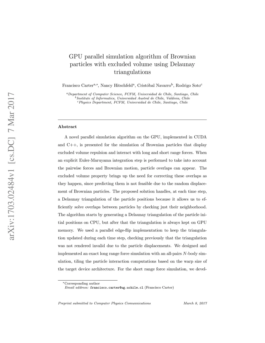 A novel parallel simulation algorithm on the GPU, implemented in CUDA and C++, is presented for the simulation of Brownian particles that display excluded volume repulsion and interact with long and short range forces. When an explicit Euler-Maruyama integration step is performed to take into account the pairwise forces and Brownian motion, particle overlaps can appear. The excluded volume property brings up the need for correcting these overlaps as they happen, since predicting them is not feasible due to the random displacement of Brownian particles. The proposed solution handles, at each time step, a Delaunay triangulation of the particle positions because it allows us to efficiently solve overlaps between particles by checking just their neighborhood. The algorithm starts by generating a Delaunay triangulation of the particle initial positions on CPU, but after that the triangulation is always kept on GPU memory. We used a parallel edge-flip implementation to keep the triangulation updated during each time step, checking previously that the triangulation was not rendered invalid due to the particle displacements. The algorithm is validated with two models of active colloidal particles. Upon testing the parallel implementation of a long range forces simulation, the results show a performance improvement of up to two orders of magnitude when compared to the previously existing sequential solution.
