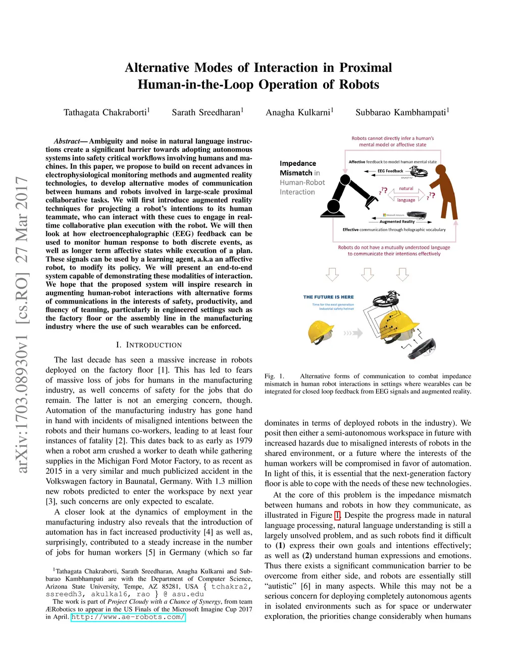 Ambiguity and noise in natural language instructions create a significant barrier towards adopting autonomous systems into safety critical workflows involving humans and machines. In this paper, we propose to build on recent advances in electrophysiological monitoring methods and augmented reality technologies, to develop alternative modes of communication between humans and robots involved in large-scale proximal collaborative tasks. We will first introduce augmented reality techniques for projecting a robot's intentions to its human teammate, who can interact with these cues to engage in real-time collaborative plan execution with the robot. We will then look at how electroencephalographic (EEG) feedback can be used to monitor human response to both discrete events, as well as longer term affective states while execution of a plan. These signals can be used by a learning agent, a.k.a an affective robot, to modify its policy. We will present an end-to-end system capable of demonstrating these modalities of interaction. We hope that the proposed system will inspire research in augmenting human-robot interactions with alternative forms of communications in the interests of safety, productivity, and fluency of teaming, particularly in engineered settings such as the factory floor or the assembly line in the manufacturing industry where the use of such wearables can be enforced.