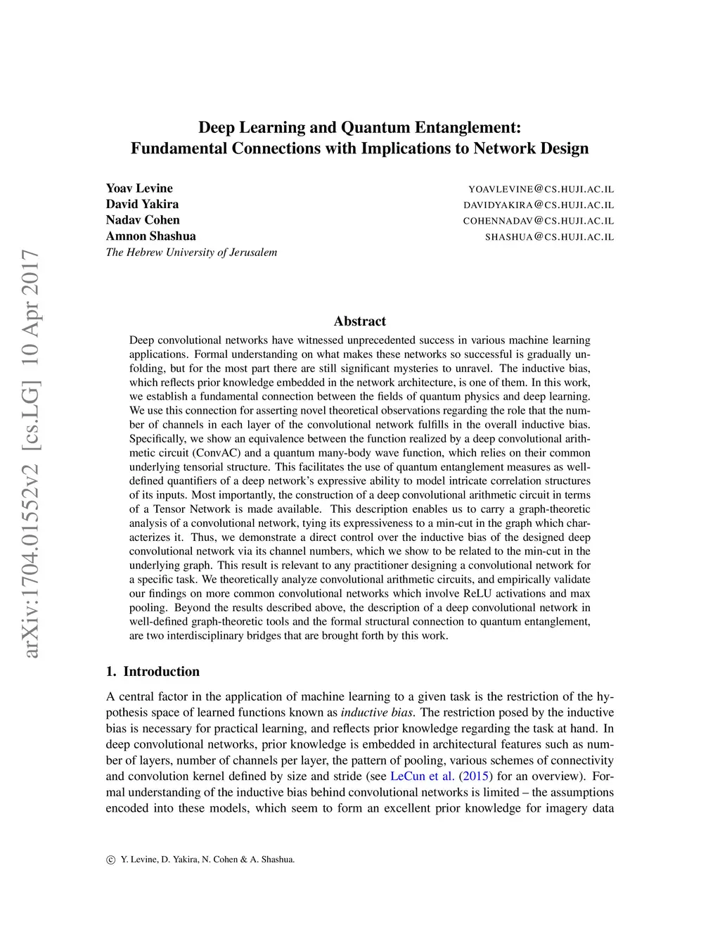 Deep convolutional networks have witnessed unprecedented success in various machine learning applications. Formal understanding on what makes these networks so successful is gradually unfolding, but for the most part there are still significant mysteries to unravel. The inductive bias, which reflects prior knowledge embedded in the network architecture, is one of them. In this work, we establish a fundamental connection between the fields of quantum physics and deep learning. We use this connection for asserting novel theoretical observations regarding the role that the number of channels in each layer of the convolutional network fulfills in the overall inductive bias. Specifically, we show an equivalence between the function realized by a deep convolutional arithmetic circuit (ConvAC) and a quantum many-body wave function, which relies on their common underlying tensorial structure. This facilitates the use of quantum entanglement measures as well-defined quantifiers of a deep network's expressive ability to model intricate correlation structures of its inputs. Most importantly, the construction of a deep ConvAC in terms of a Tensor Network is made available. This description enables us to carry a graph-theoretic analysis of a convolutional network, with which we demonstrate a direct control over the inductive bias of the deep network via its channel numbers, that are related to the min-cut in the underlying graph. This result is relevant to any practitioner designing a network for a specific task. We theoretically analyze ConvACs, and empirically validate our findings on more common ConvNets which involve ReLU activations and max pooling. Beyond the results described above, the description of a deep convolutional network in well-defined graph-theoretic tools and the formal connection to quantum entanglement, are two interdisciplinary bridges that are brought forth by this work.