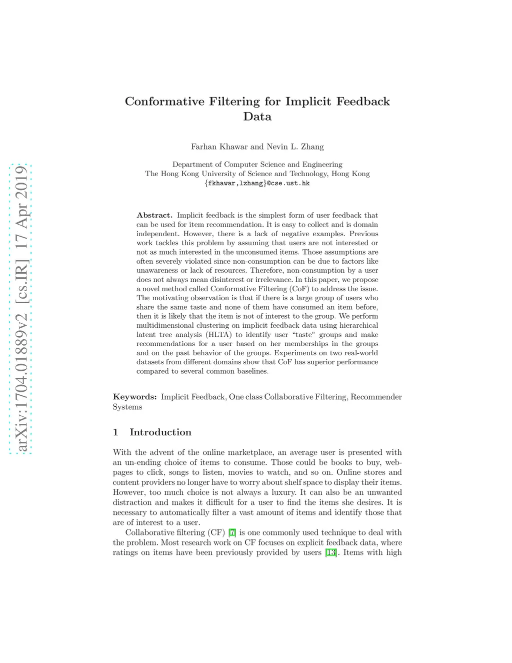Implicit feedback is the simplest form of user feedback that can be used for item recommendation. It is easy to collect and is domain independent. However, there is a lack of negative examples. Previous work tackles this problem by assuming that users are not interested or not as much interested in the unconsumed items. Those assumptions are often severely violated since non-consumption can be due to factors like unawareness or lack of resources. Therefore, non-consumption by a user does not always mean disinterest or irrelevance. In this paper, we propose a novel method called Conformative Filtering (CoF) to address the issue. The motivating observation is that if there is a large group of users who share the same taste and none of them have consumed an item before, then it is likely that the item is not of interest to the group. We perform multidimensional clustering on implicit feedback data using hierarchical latent tree analysis (HLTA) to identify user `tastes' groups and make recommendations for a user based on her memberships in the groups and on the past behavior of the groups. Experiments on two real-world datasets from different domains show that CoF has superior performance compared to several common baselines.