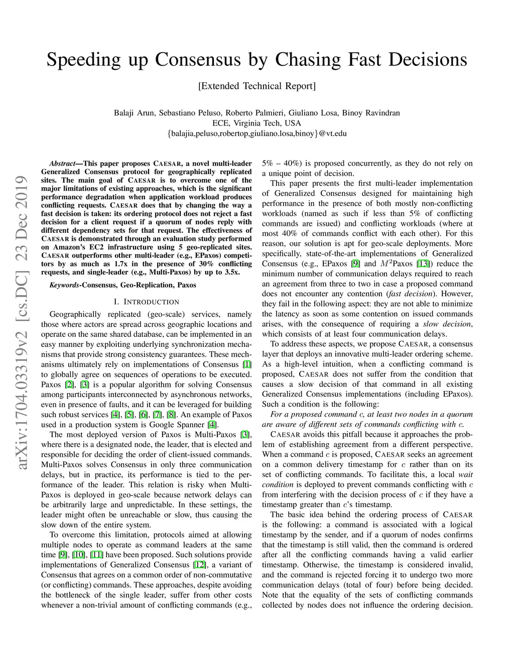 This paper proposes Caesar, a novel multi-leader Generalized Consensus protocol for geographically replicated sites. The main goal of Caesar is to overcome one of the major limitations of existing approaches, which is the significant performance degradation when application workload produces conflicting requests. Caesar does that by changing the way a fast decision is taken: its ordering protocol does not reject a fast decision for a client request if a quorum of nodes reply with different dependency sets for that request. The effectiveness of Caesar is demonstrated through an evaluation study performed on Amazon's EC2 infrastructure using 5 geo-replicated sites. Caesar outperforms other multi-leader (e.g., EPaxos) competitors by as much as 1.7x in the presence of 30% conflicting requests, and single-leader (e.g., Multi-Paxos) by up to 3.5x.