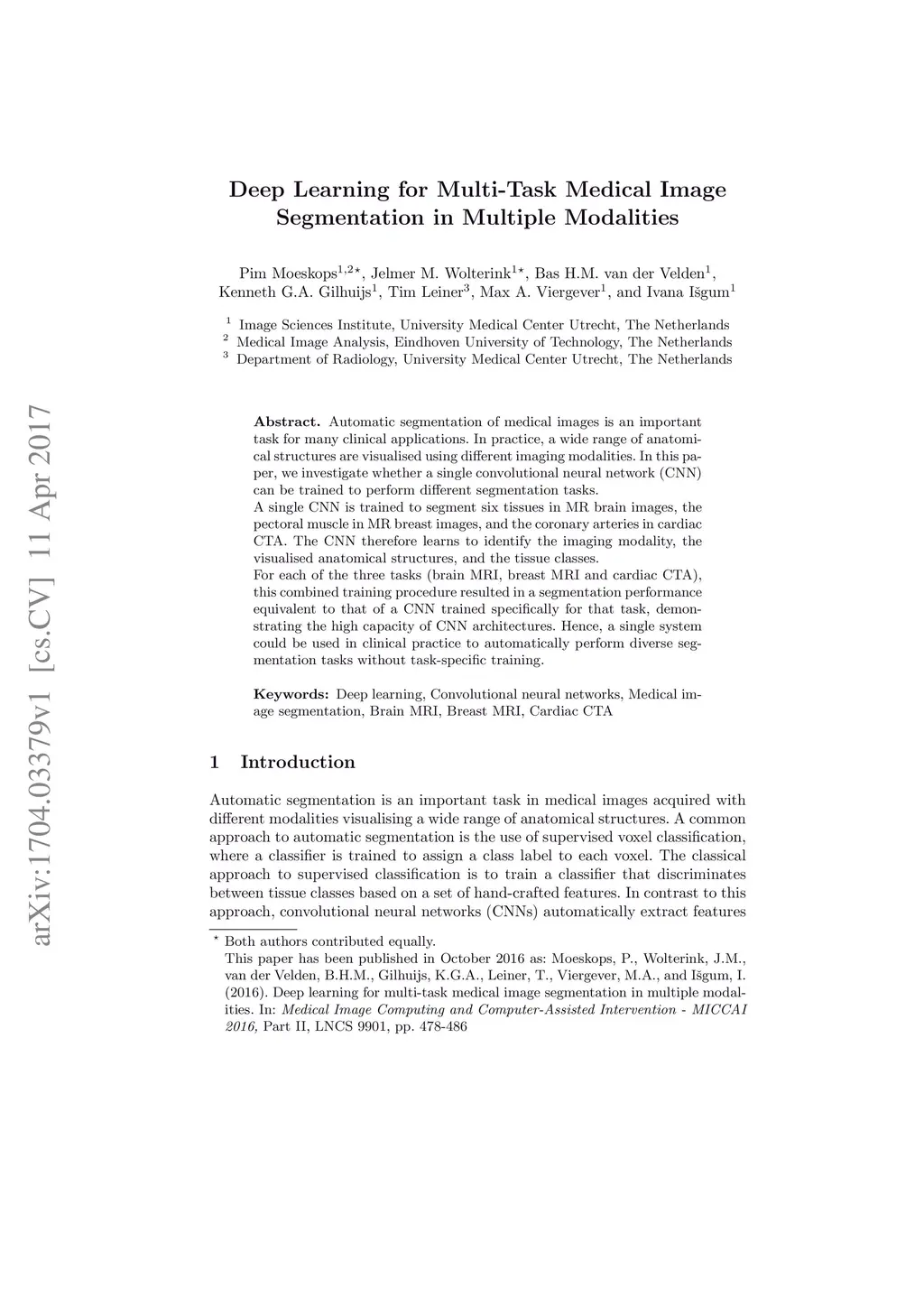Automatic segmentation of medical images is an important task for many clinical applications. In practice, a wide range of anatomical structures are visualised using different imaging modalities. In this paper, we investigate whether a single convolutional neural network (CNN) can be trained to perform different segmentation tasks. A single CNN is trained to segment six tissues in MR brain images, the pectoral muscle in MR breast images, and the coronary arteries in cardiac CTA. The CNN therefore learns to identify the imaging modality, the visualised anatomical structures, and the tissue classes. For each of the three tasks (brain MRI, breast MRI and cardiac CTA), this combined training procedure resulted in a segmentation performance equivalent to that of a CNN trained specifically for that task, demonstrating the high capacity of CNN architectures. Hence, a single system could be used in clinical practice to automatically perform diverse segmentation tasks without task-specific training.