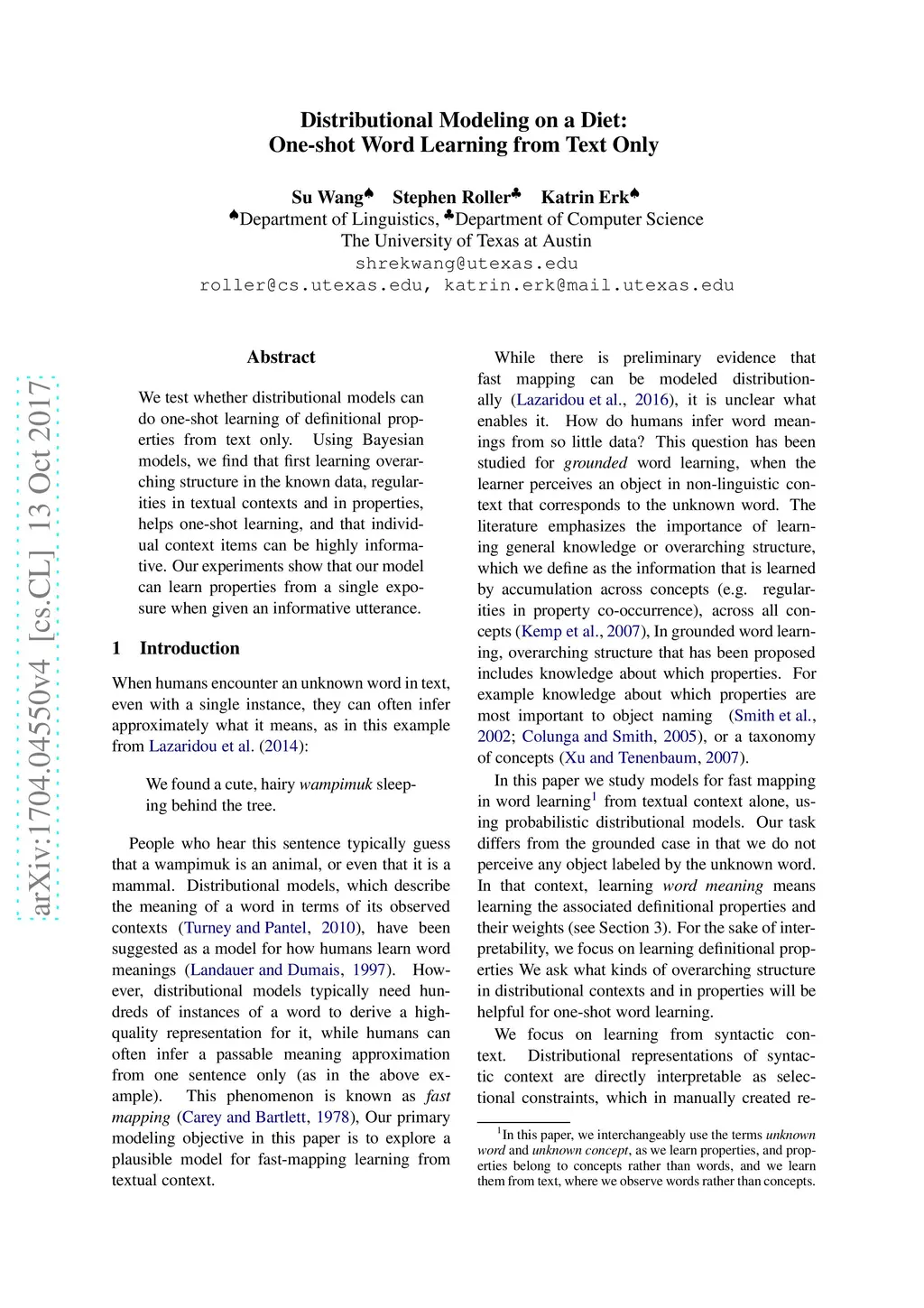 We test whether distributional models can do one-shot learning of definitional properties from text only. Using Bayesian models, we find that first learning overarching structure in the known data, regularities in textual contexts and in properties, helps one-shot learning, and that individual context items can be highly informative. Our experiments show that our model can learn properties from a single exposure when given an informative utterance.