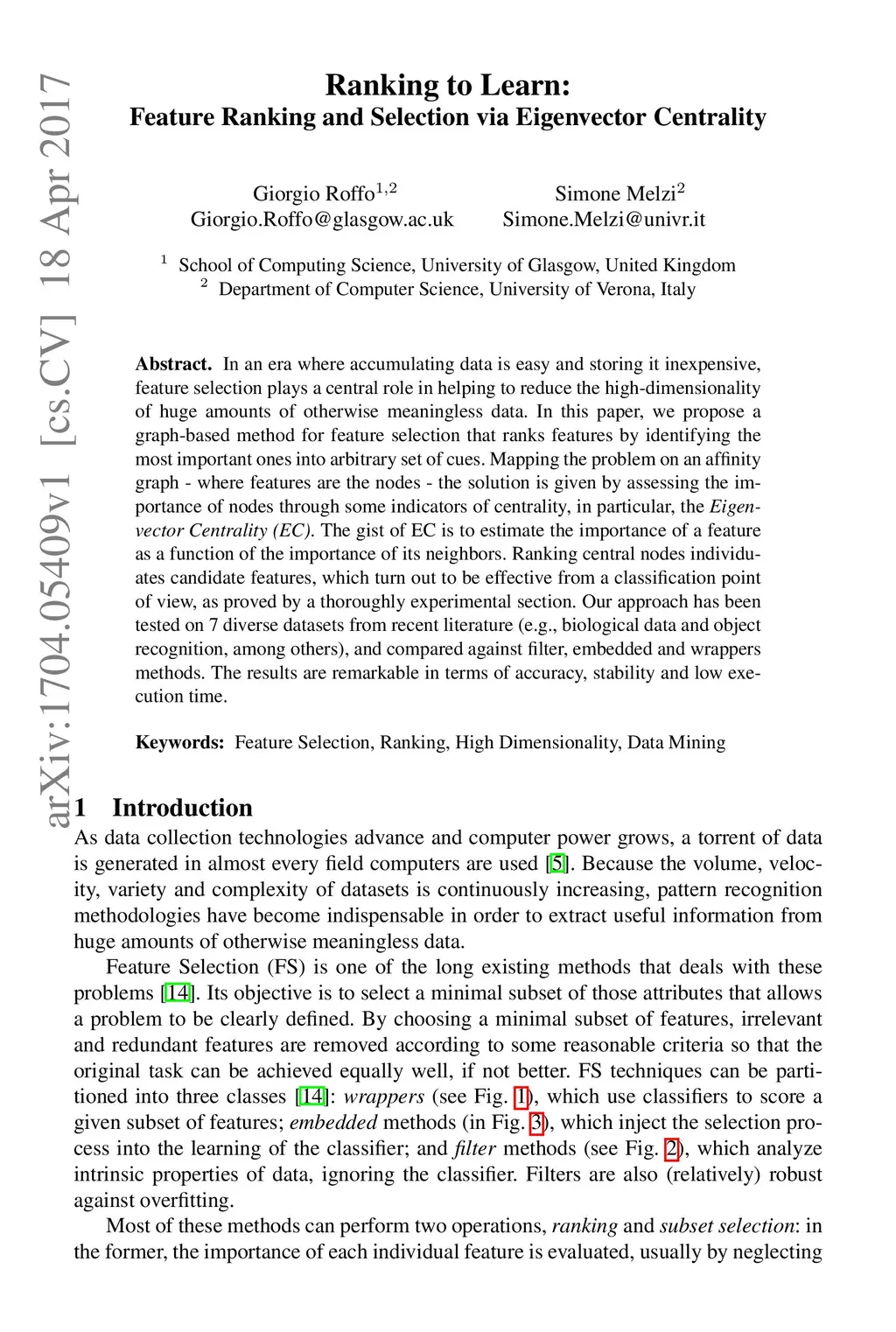 Ranking to Learn: Feature Ranking and Selection via Eigenvector