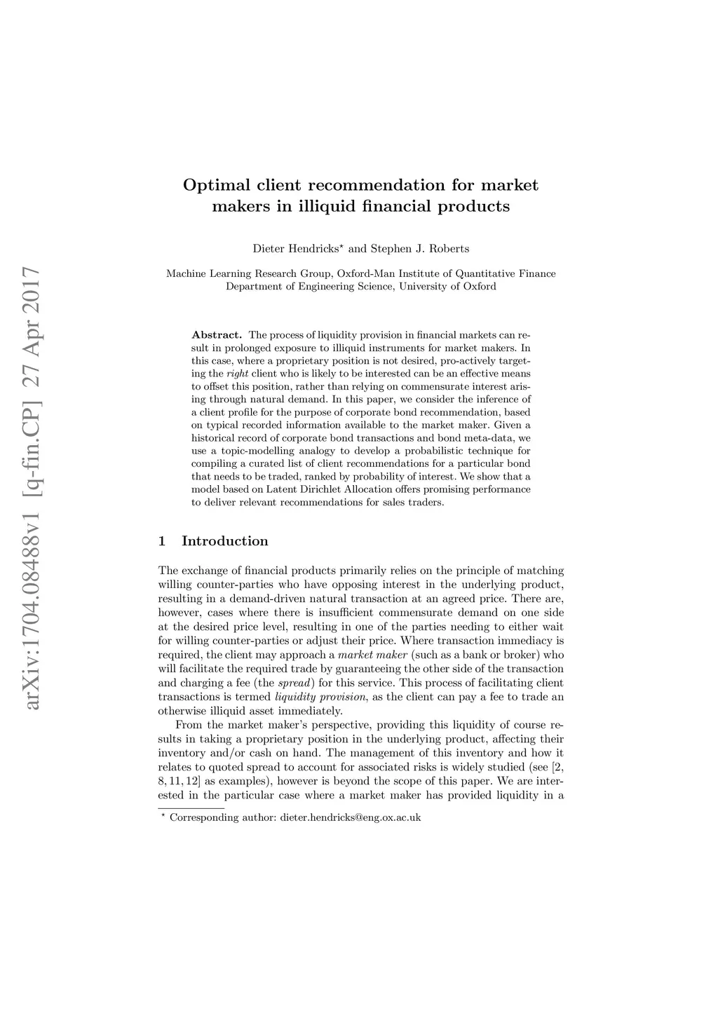 The process of liquidity provision in financial markets can result in prolonged exposure to illiquid instruments for market makers. In this case, where a proprietary position is not desired, pro-actively targeting the right client who is likely to be interested can be an effective means to offset this position, rather than relying on commensurate interest arising through natural demand. In this paper, we consider the inference of a client profile for the purpose of corporate bond recommendation, based on typical recorded information available to the market maker. Given a historical record of corporate bond transactions and bond meta-data, we use a topic-modelling analogy to develop a probabilistic technique for compiling a curated list of client recommendations for a particular bond that needs to be traded, ranked by probability of interest. We show that a model based on Latent Dirichlet Allocation offers promising performance to deliver relevant recommendations for sales traders.