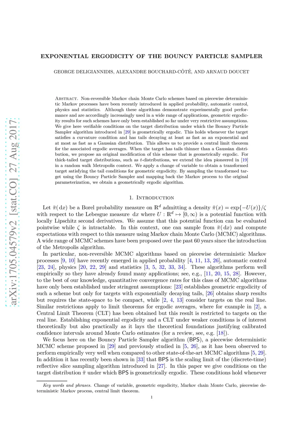 Non-reversible Markov chain Monte Carlo schemes based on piecewise deterministic Markov processes have been recently introduced in applied probability, automatic control, physics and statistics. Although these algorithms demonstrate experimentally good performance and are accordingly increasingly used in a wide range of applications, geometric ergodicity results for such schemes have only been established so far under very restrictive assumptions. We give here verifiable conditions on the target distribution under which the Bouncy Particle Sampler algorithm introduced in \cite{P_dW_12} is geometrically ergodic. This holds whenever the target satisfies a curvature condition and has tails decaying at least as fast as an exponential and at most as fast as a Gaussian distribution. This allows us to provide a central limit theorem for the associated ergodic averages. When the target has tails thinner than a Gaussian distribution, we propose an original modification of this scheme that is geometrically ergodic. For thick-tailed target distributions, such as -distributions, we extend the idea pioneered in \cite{J_G_12} in a random walk Metropolis context. We apply a change of variable to obtain a transformed target satisfying the tail conditions for geometric ergodicity. By sampling the transformed target using the Bouncy Particle Sampler and mapping back the Markov process to the original parameterization, we obtain a geometrically ergodic algorithm.
