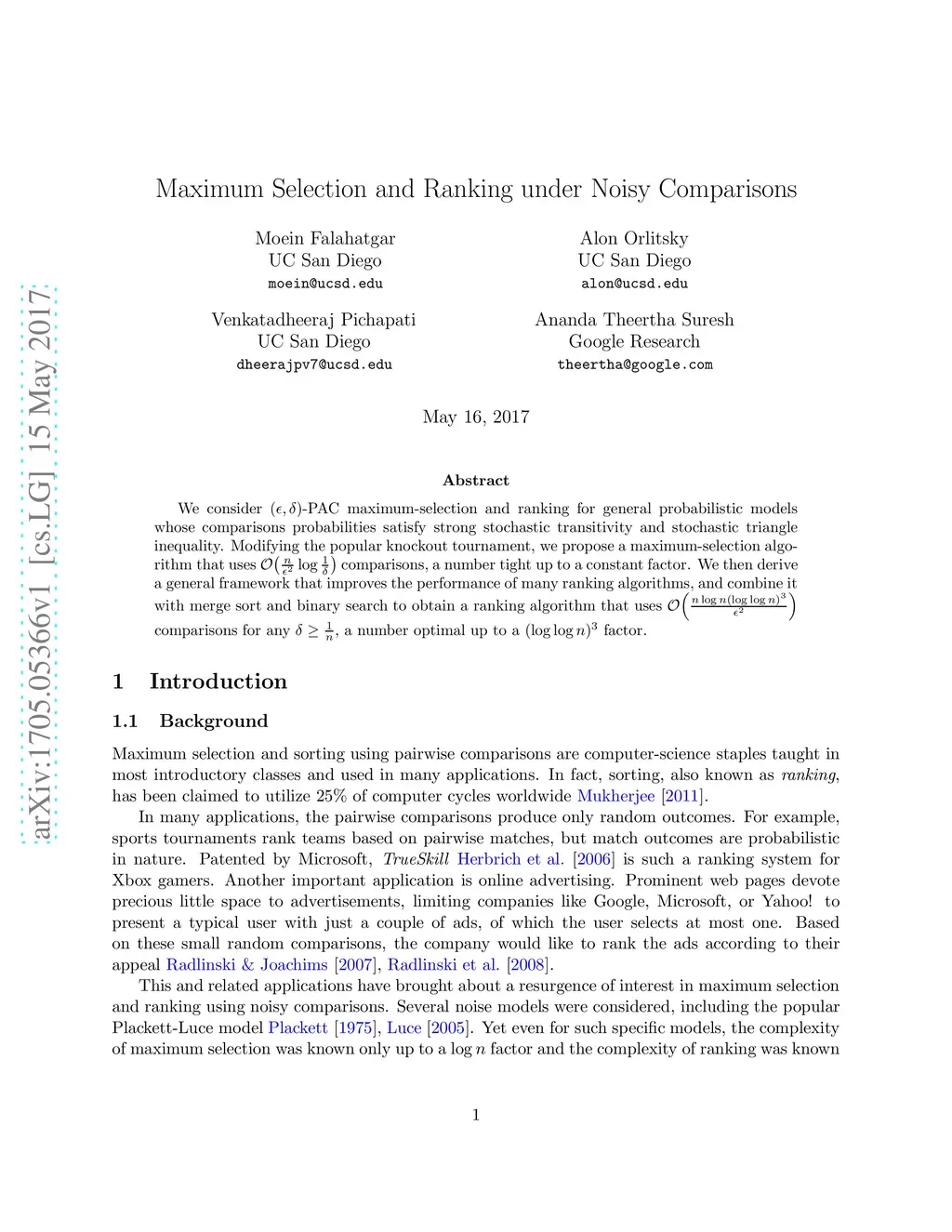 We consider -PAC maximum-selection and ranking for general probabilistic models whose comparisons probabilities satisfy strong stochastic transitivity and stochastic triangle inequality. Modifying the popular knockout tournament, we propose a maximum-selection algorithm that uses comparisons, a number tight up to a constant factor. We then derive a general framework that improves the performance of many ranking algorithms, and combine it with merge sort and binary search to obtain a ranking algorithm that uses comparisons for any , a number optimal up to a factor.